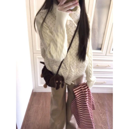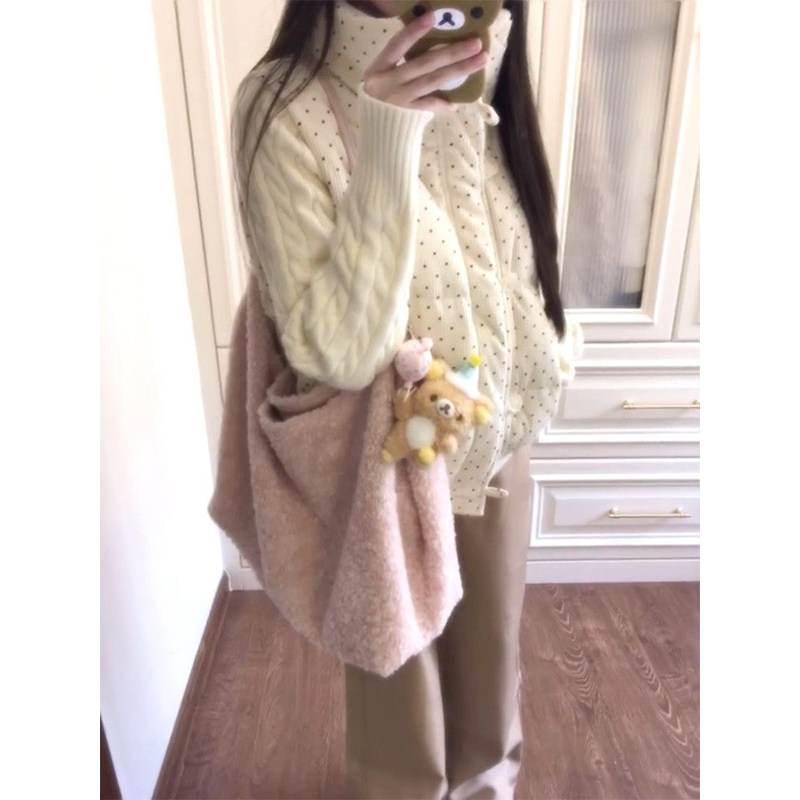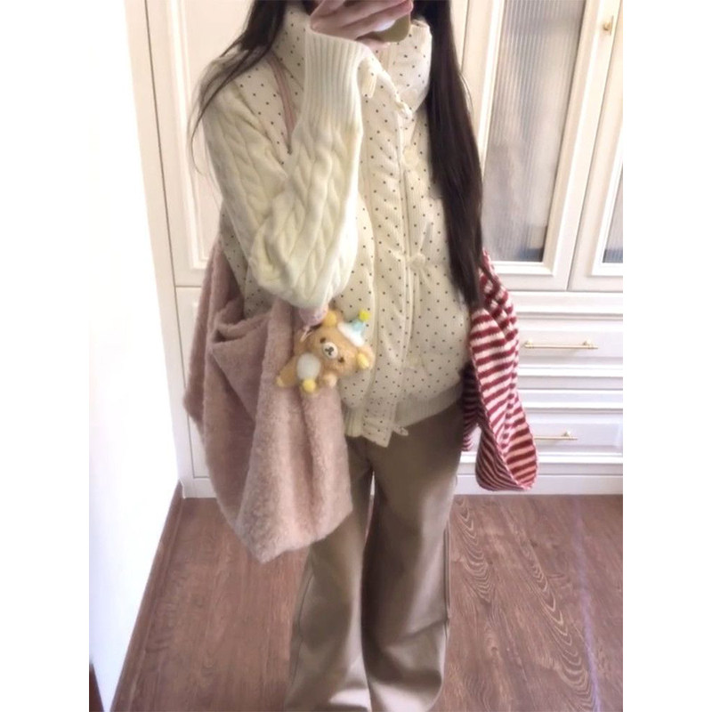 日系遮肉可爱软妹风杏色波点拼接针织羽绒棉服百搭立领棉衣外套
