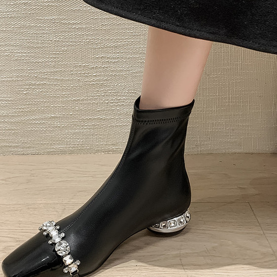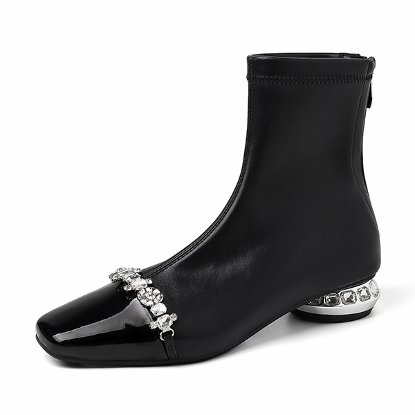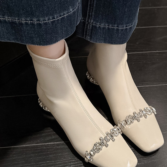 新品~秋冬漆皮亮皮短靴女单靴方头水钻气质米白色弹力靴显瘦百搭