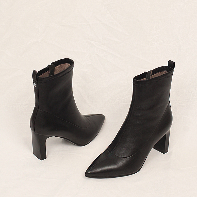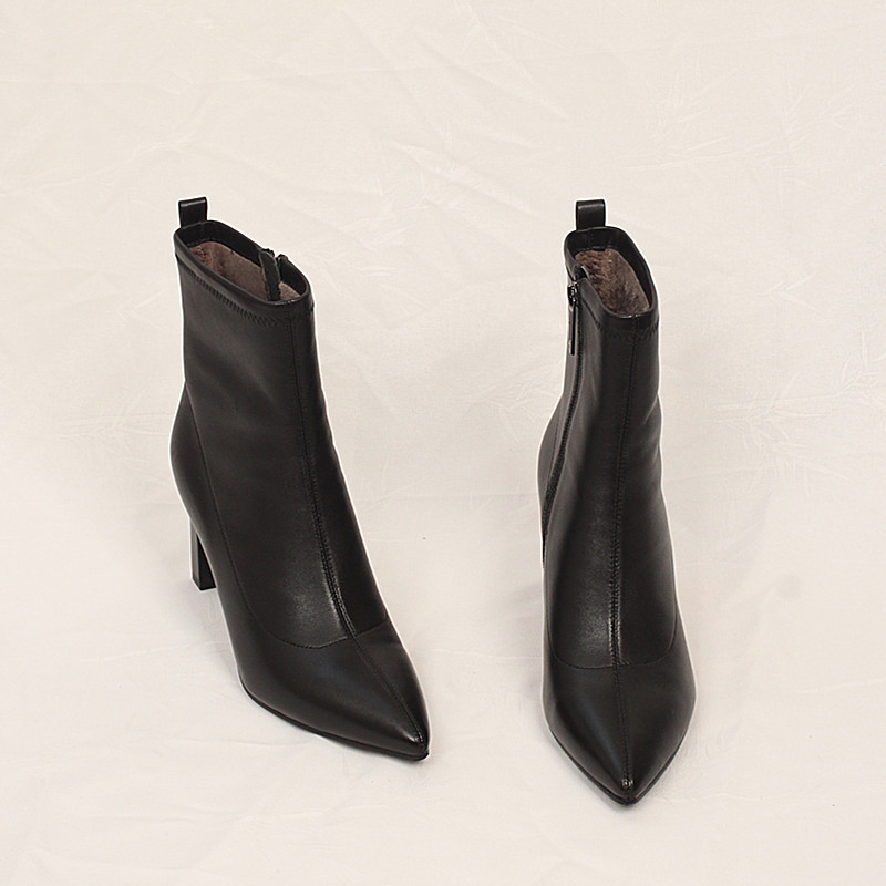商场同款冬季新款真皮时装靴绒里高跟尖头侧拉链羊皮女靴子 2K803