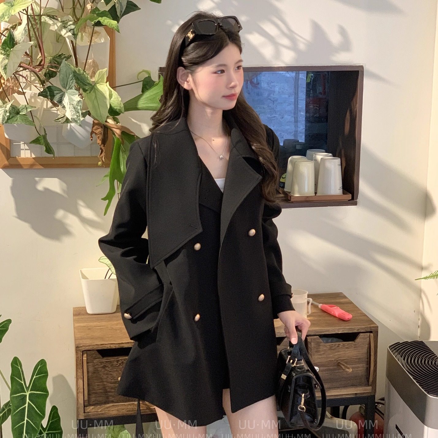 周淼黑色风衣裙外套女围脖保暖秋冬网红爆款小个子韩系中短款大衣