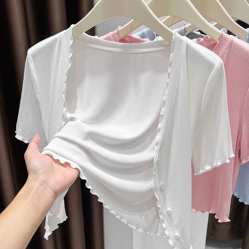 木耳花边防晒冰丝针织v领开衫配吊带外搭罩衫披肩薄外套