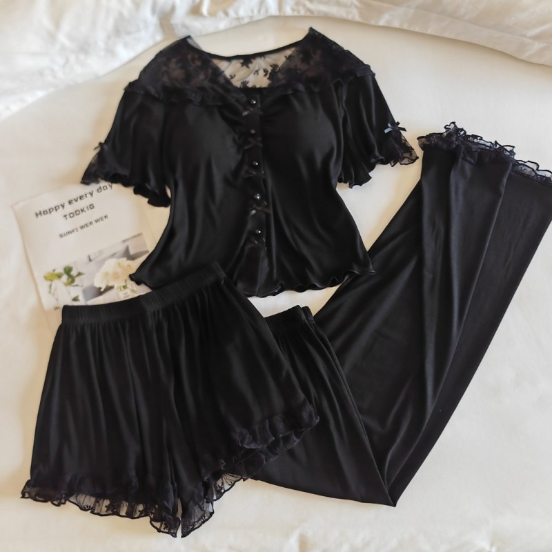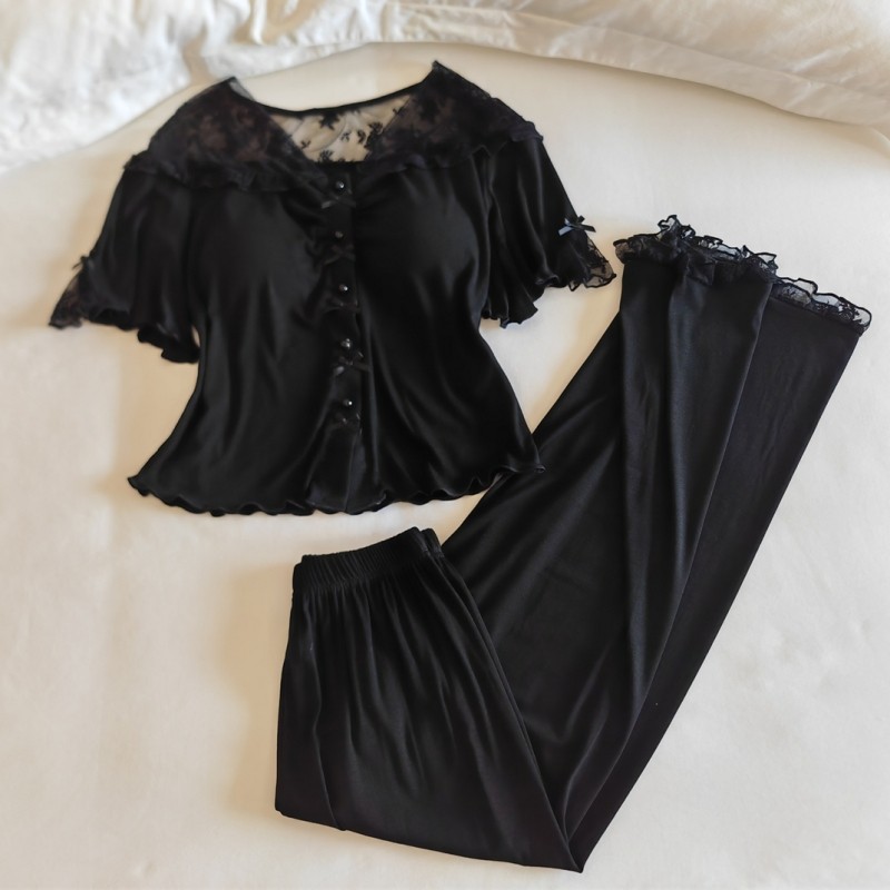 带胸垫睡衣女夏季短袖开衫两件套春秋薄款性感纯欲风莫代尔家居服