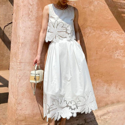 良良家设计感别致刺绣提花背心衬衫女夏季新款高腰百褶半身裙套装