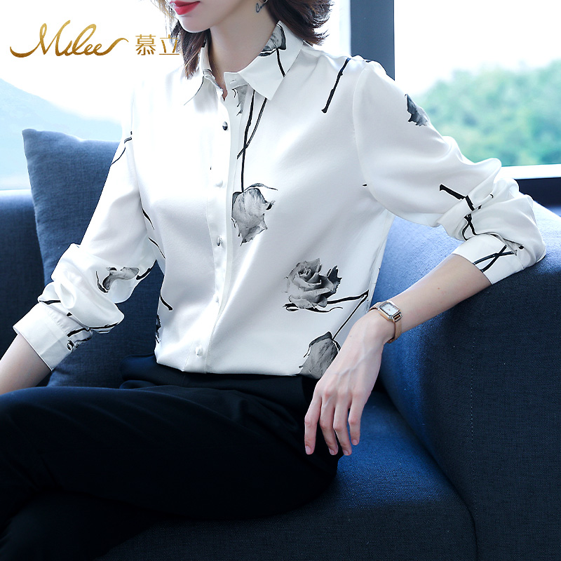 慕立2025春重磅真丝女款衬衫长袖玫瑰印花时尚洋气大码桑蚕丝上衣