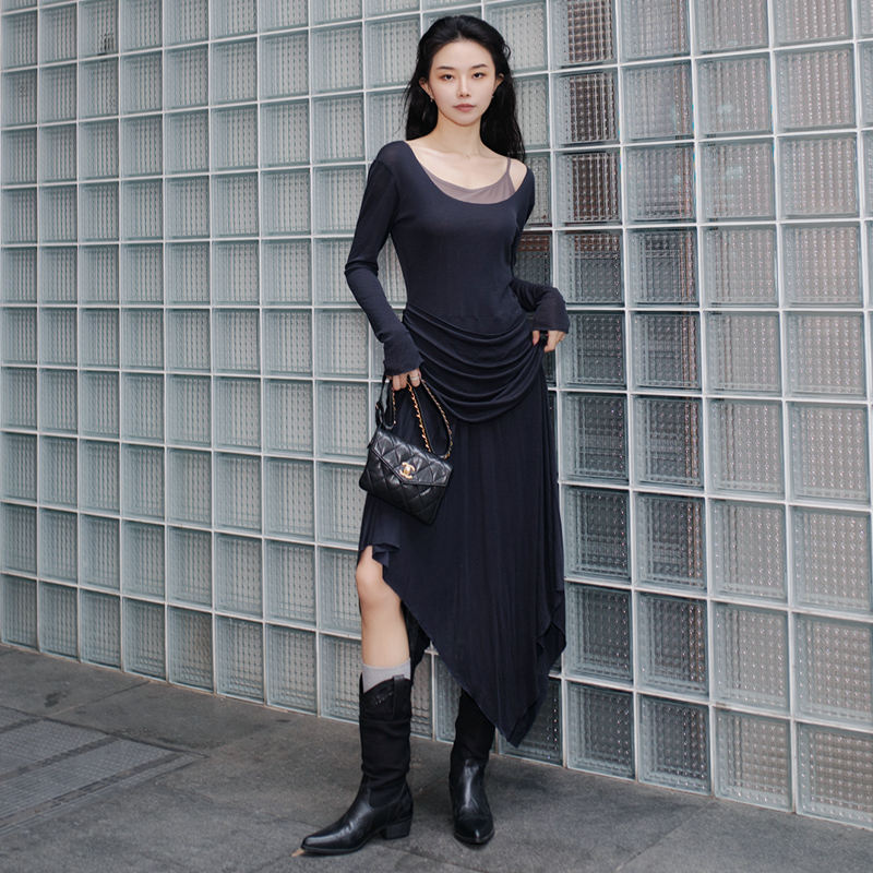 MOONA天丝绵羊毛白色长袖连衣裙女两件套U领高级感轻薄不规则长裙