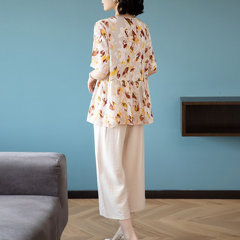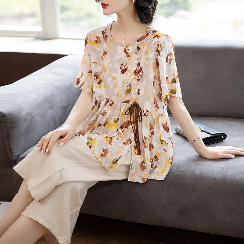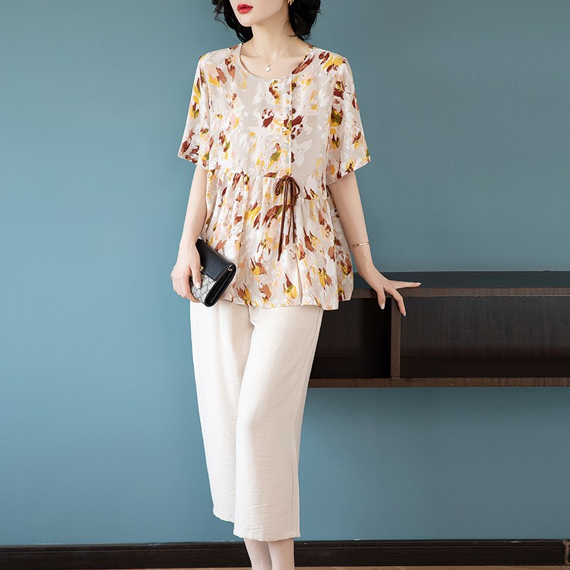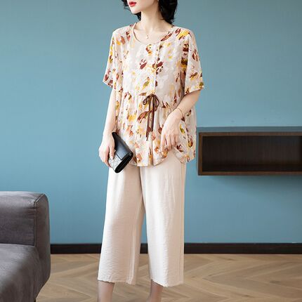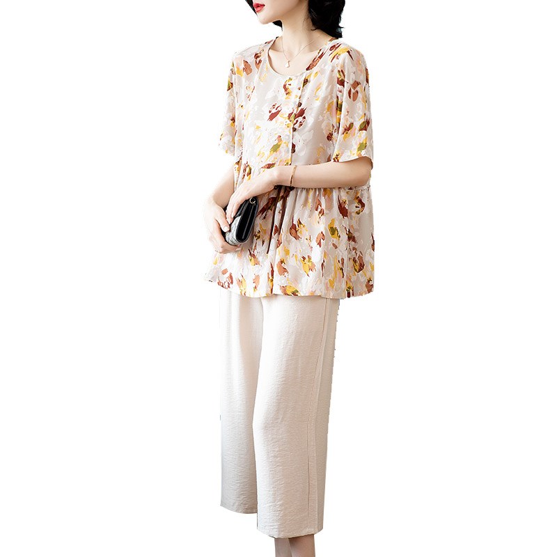 夏季新款短袖套装40岁妈妈洋气上衣中老年时尚雪纺夏装大码女装