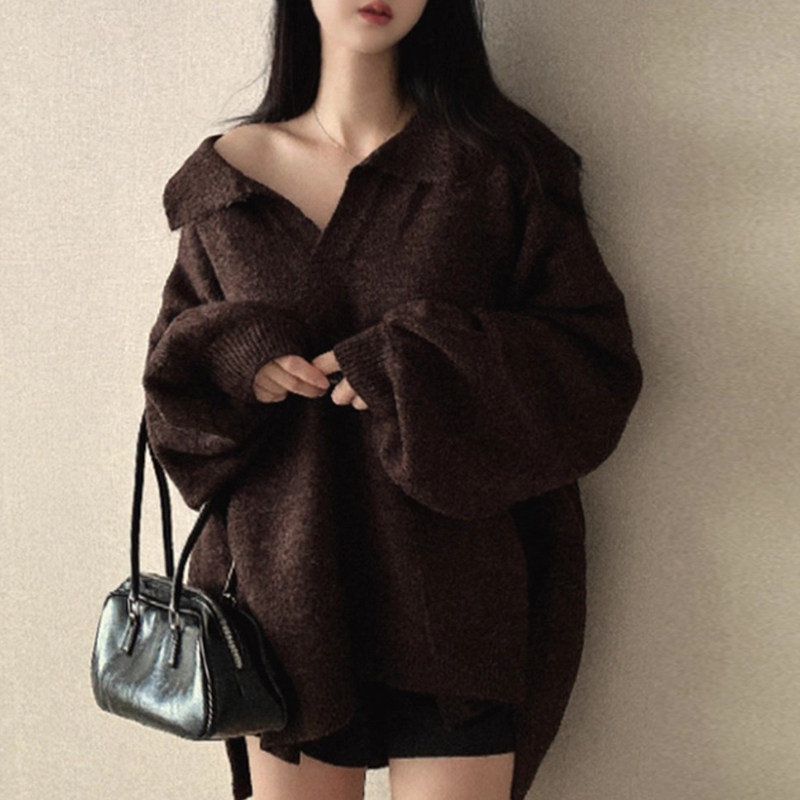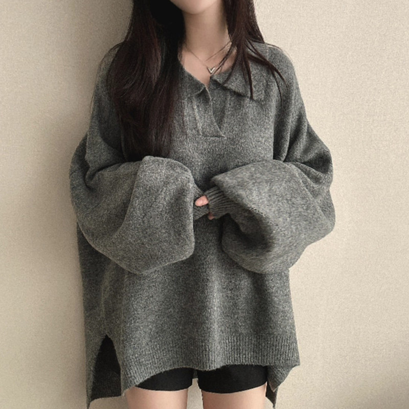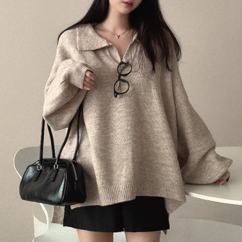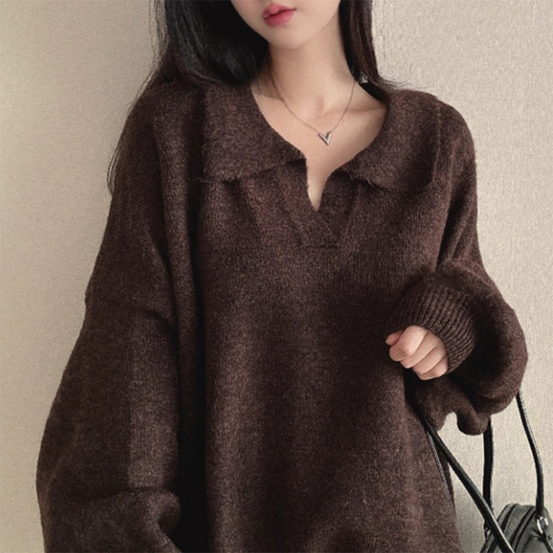 韩国chic秋冬新款法式慵懒风polo领宽松中长款软糯长袖针织毛衣女
