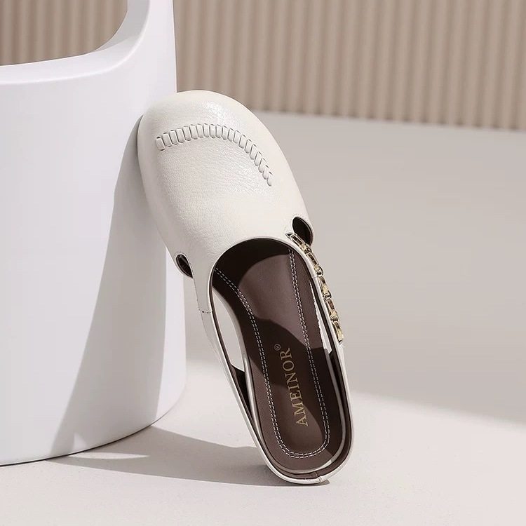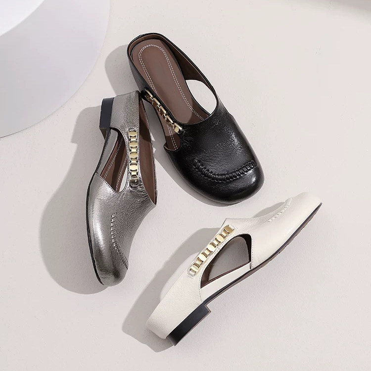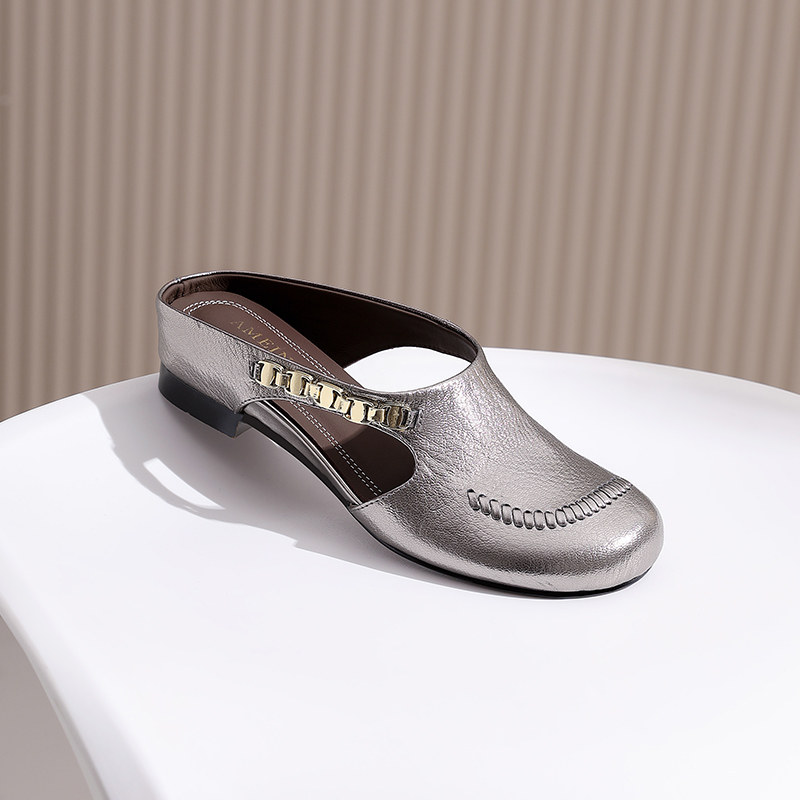 真皮圆头勃肯凉拖鞋2025年夏季新款金属链条坡跟外穿包头半拖鞋