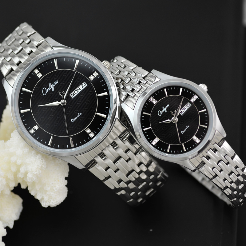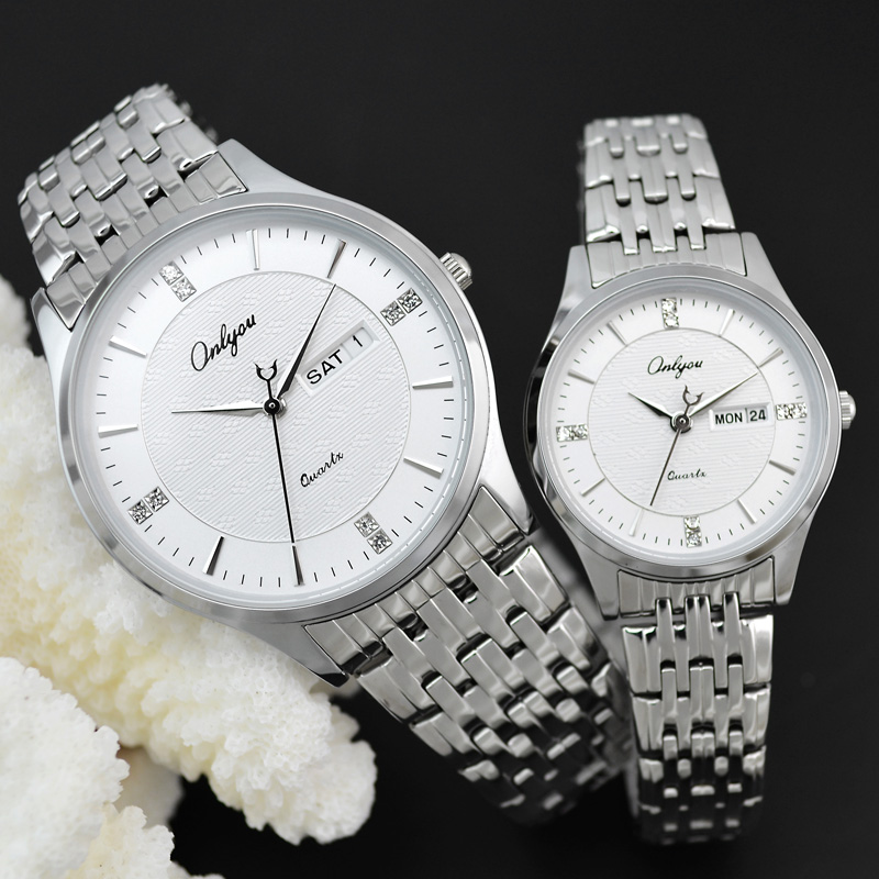 正品onlyou奥利妮时尚钢带情侣手表韩版日历防水男士腕表男女对表