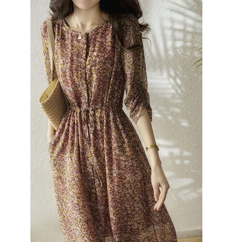 高品质桑蚕丝甜美真丝碎花连衣裙