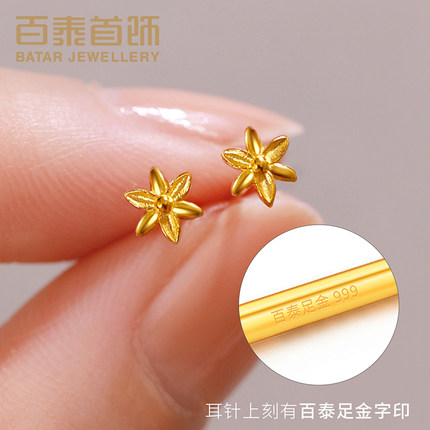 百泰首饰黄金耳钉足金999耳饰花朵养耳棒金耳坠小花金耳棍女友礼