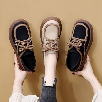 黑色圆头英伦风厚底小皮鞋女秋冬2024新款法式复古增高深口单鞋子