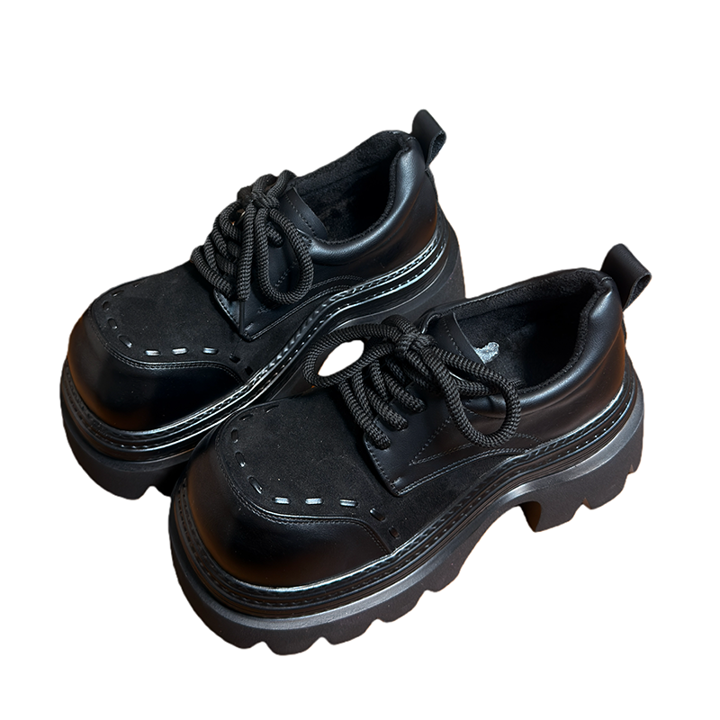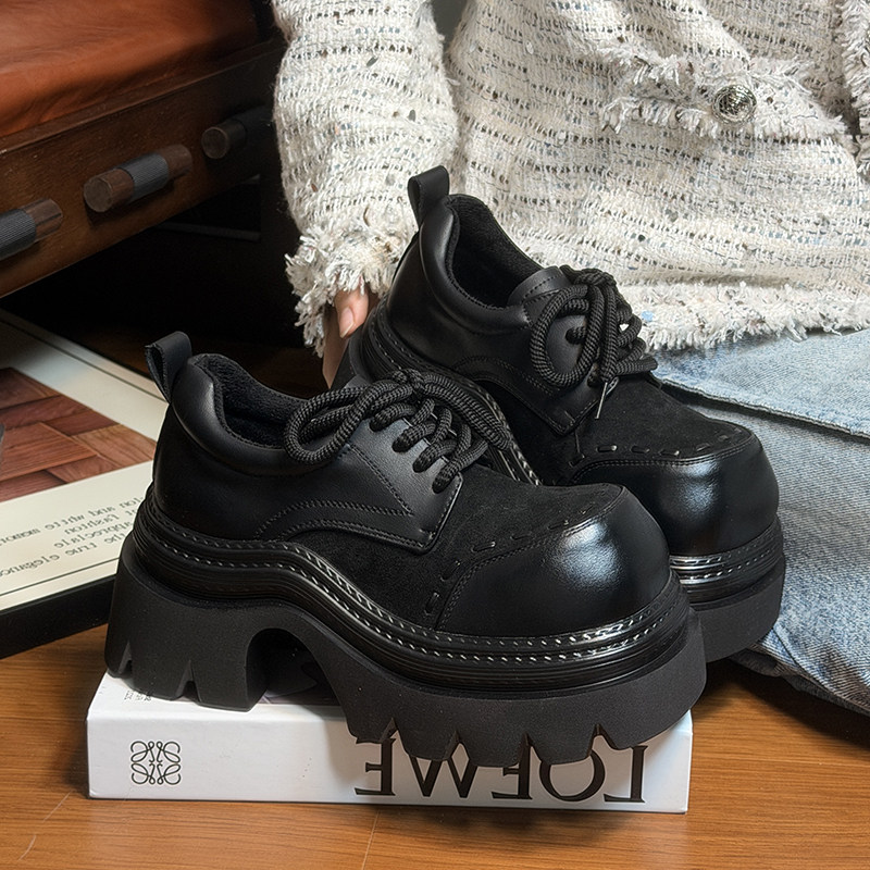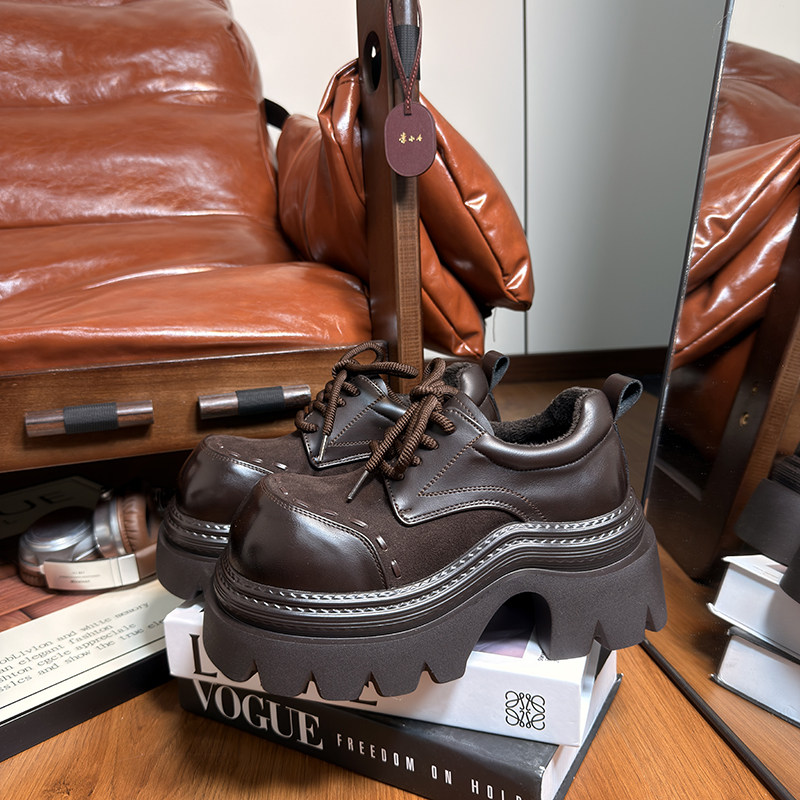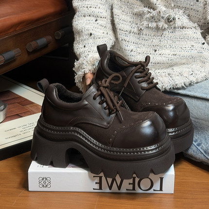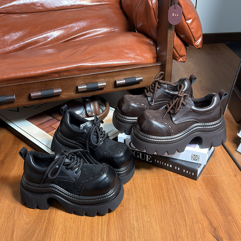 复古真皮松糕厚底小皮鞋女英伦风圆头德比鞋小个子增高加绒乐福鞋