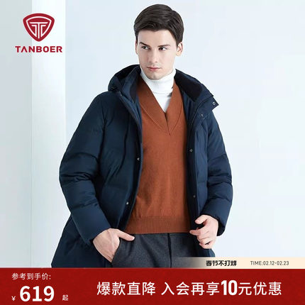 坦博尔冬季羽绒服男士宽松休闲无缝可脱卸帽加厚保暖商务品质外套