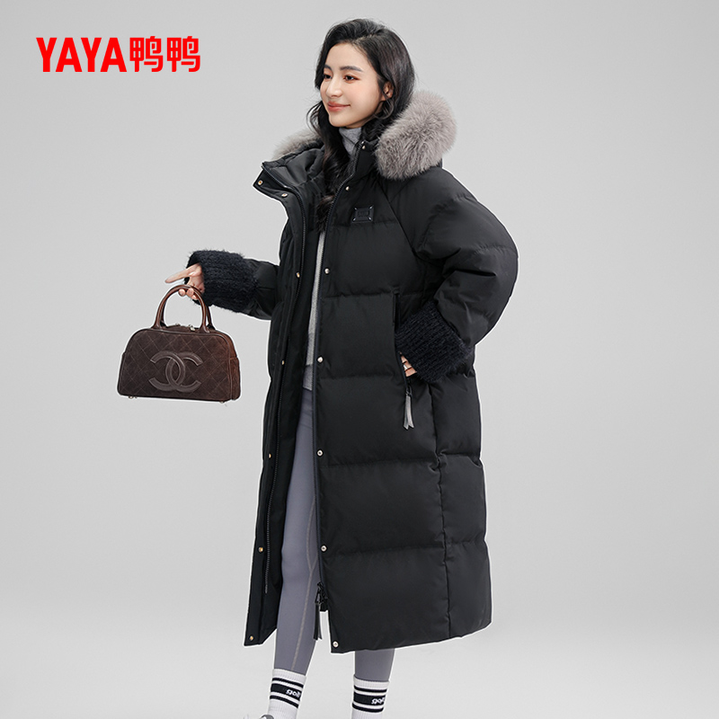 鸭鸭超长款过膝羽绒服女2024秋冬新品狐狸毛领连帽宽松保暖外套DM