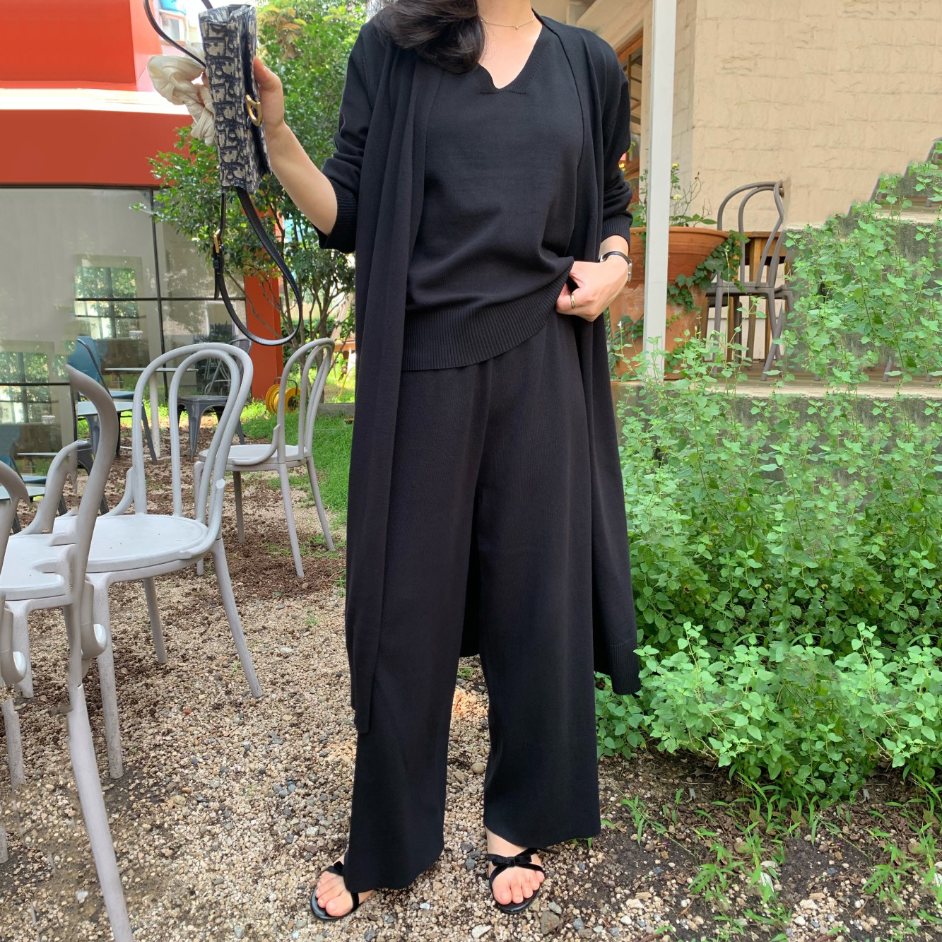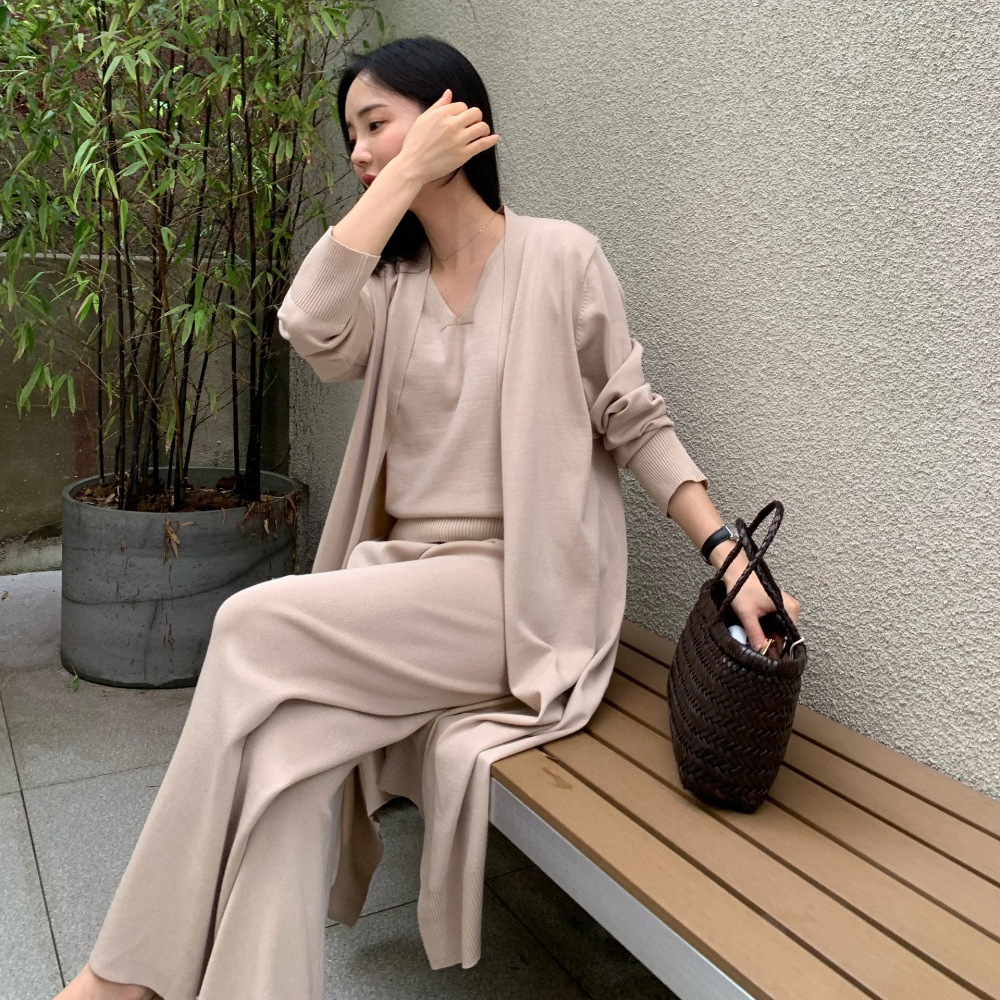 韩国中长款针织开衫背心阔腿裤