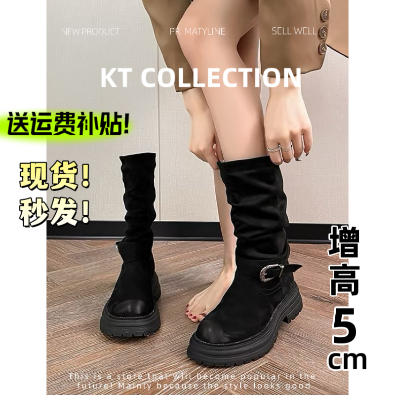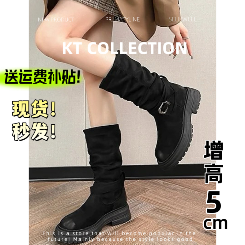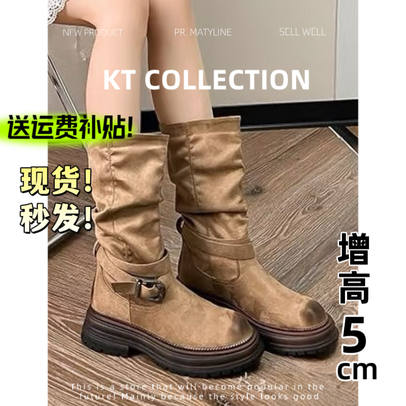 羊皮版!增高5cm法式复古西部牛仔靴女粗跟厚底马丁靴骑士靴