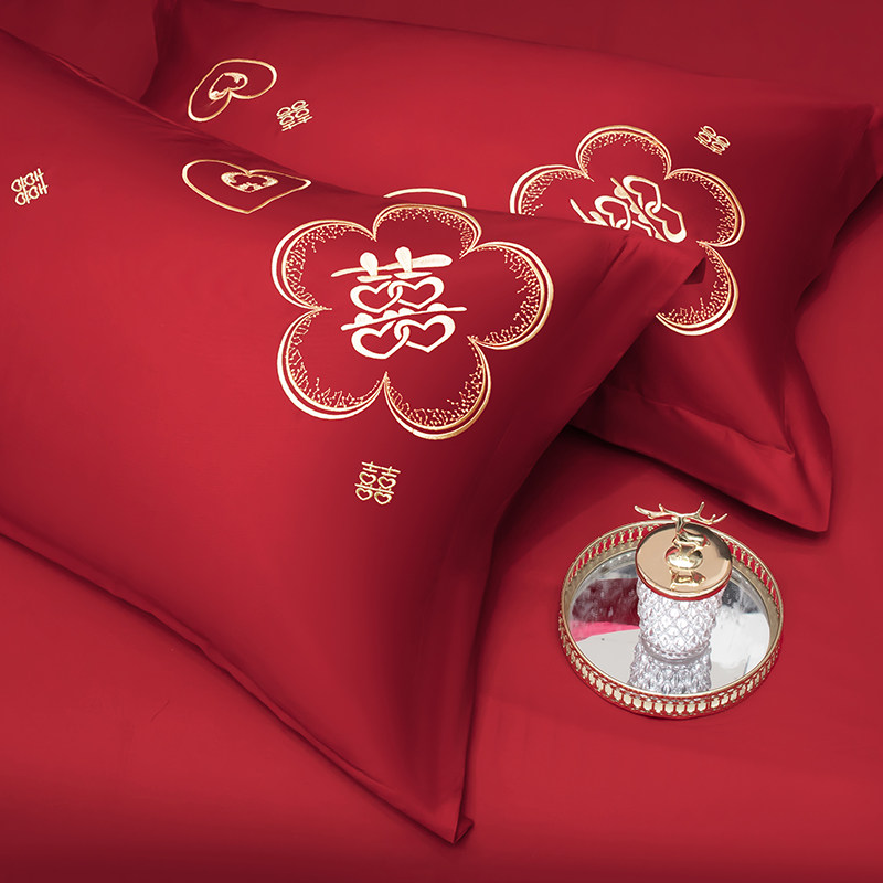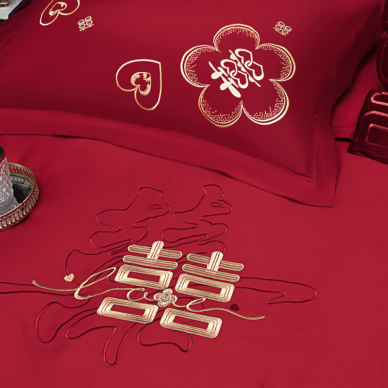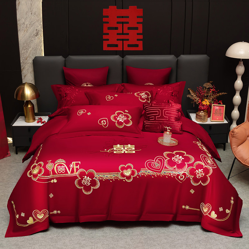 浪漫婚庆纯棉四件套刺绣大红色床单被套结婚床上用品女方陪嫁喜被