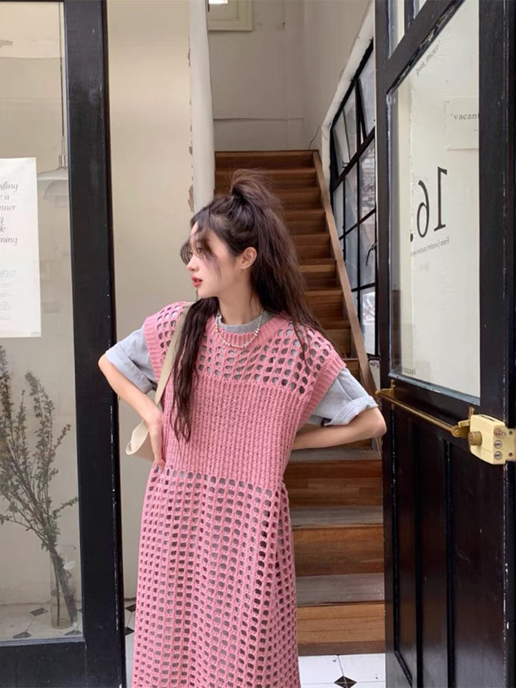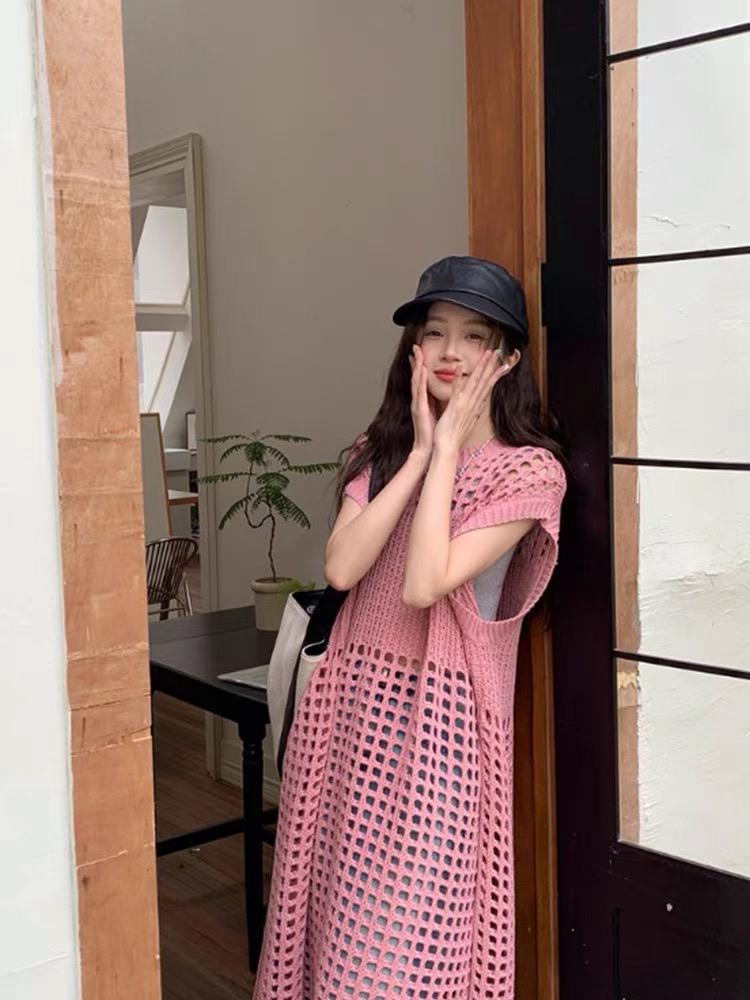 法式纯色镂空针织毛衣裙女春季中长款宽松无袖背心外搭叠穿连衣裙