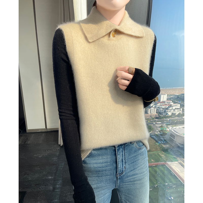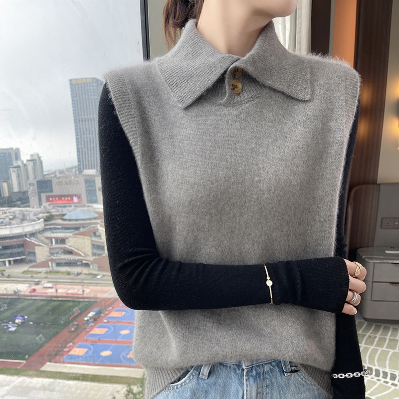 2024冬季半高领加厚100羊绒无袖马甲女宽松复古羊毛针织坎肩