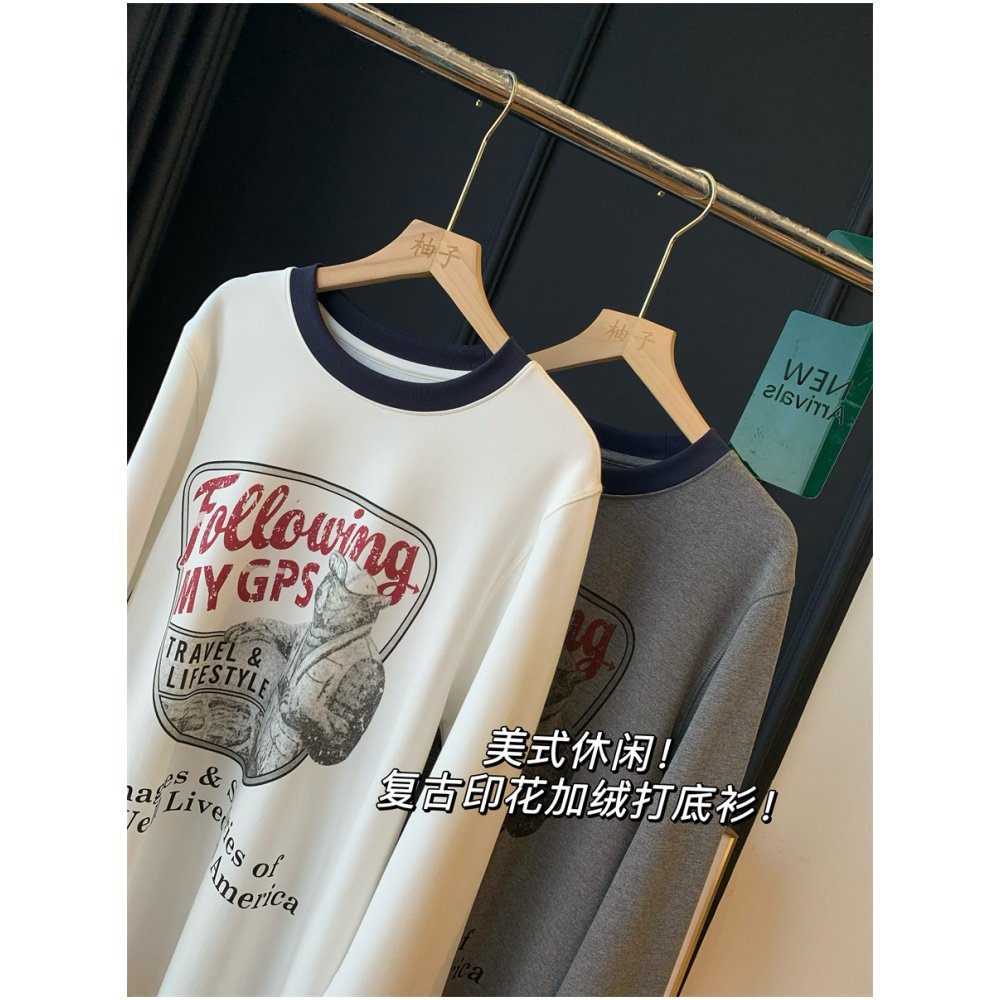 美式休闲!复古印花加绒打底衫