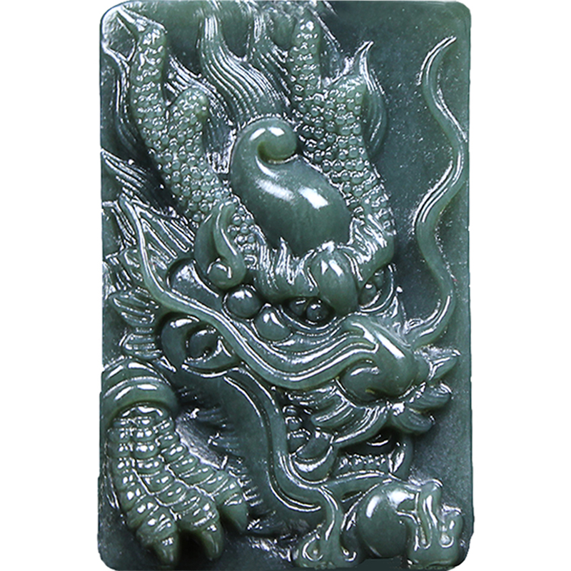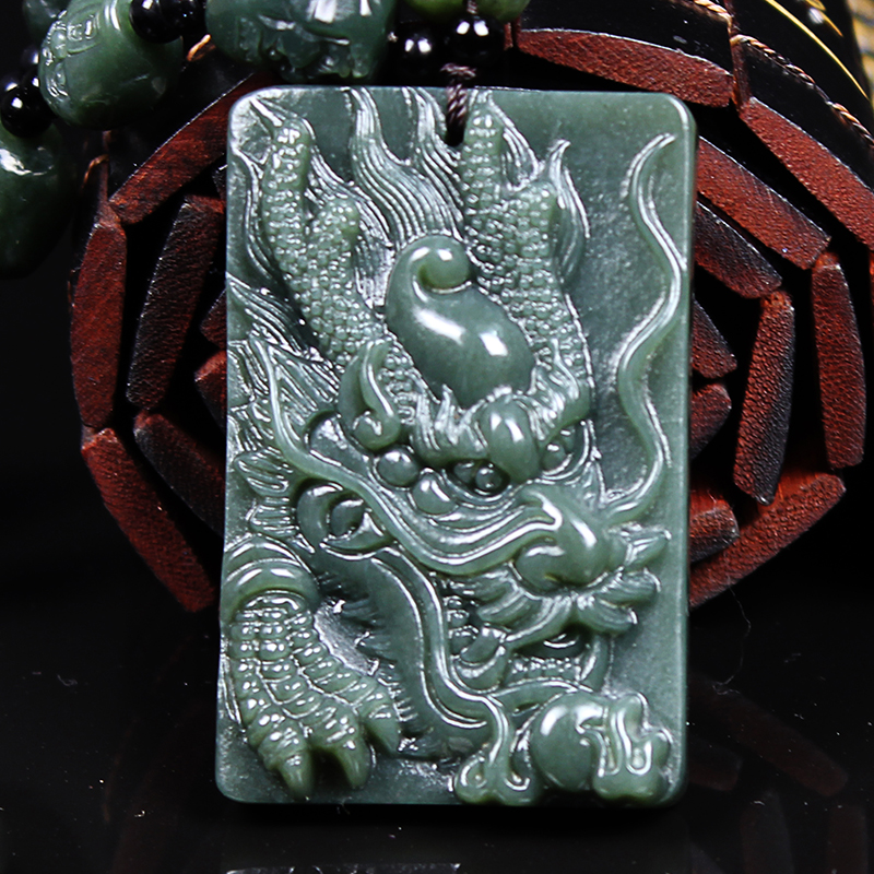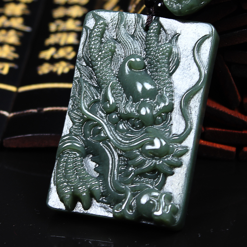 天然新疆和田玉墨玉青玉龙牌吊坠龙头玉石挂件生肖龙玉牌玉佩项链