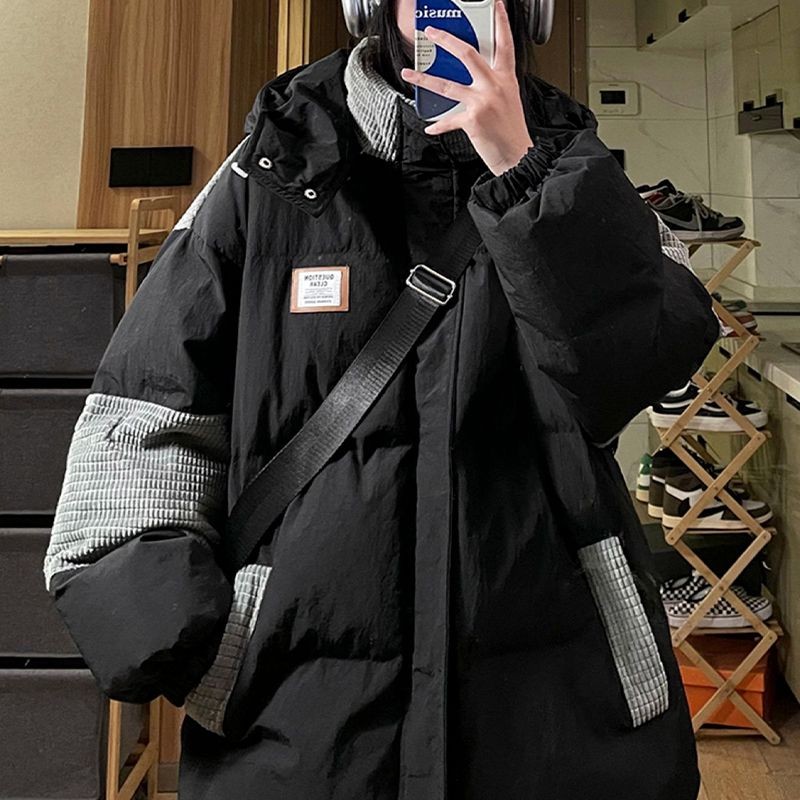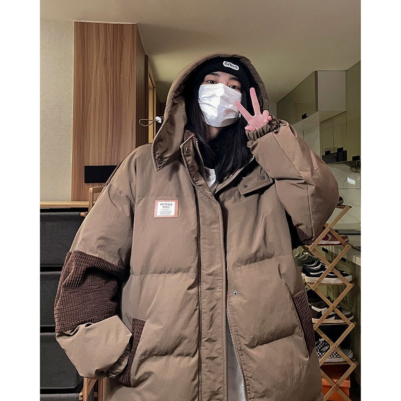 300斤大码胖mm美式工装拼接连帽羽绒棉服女冬季新款加厚宽松外套