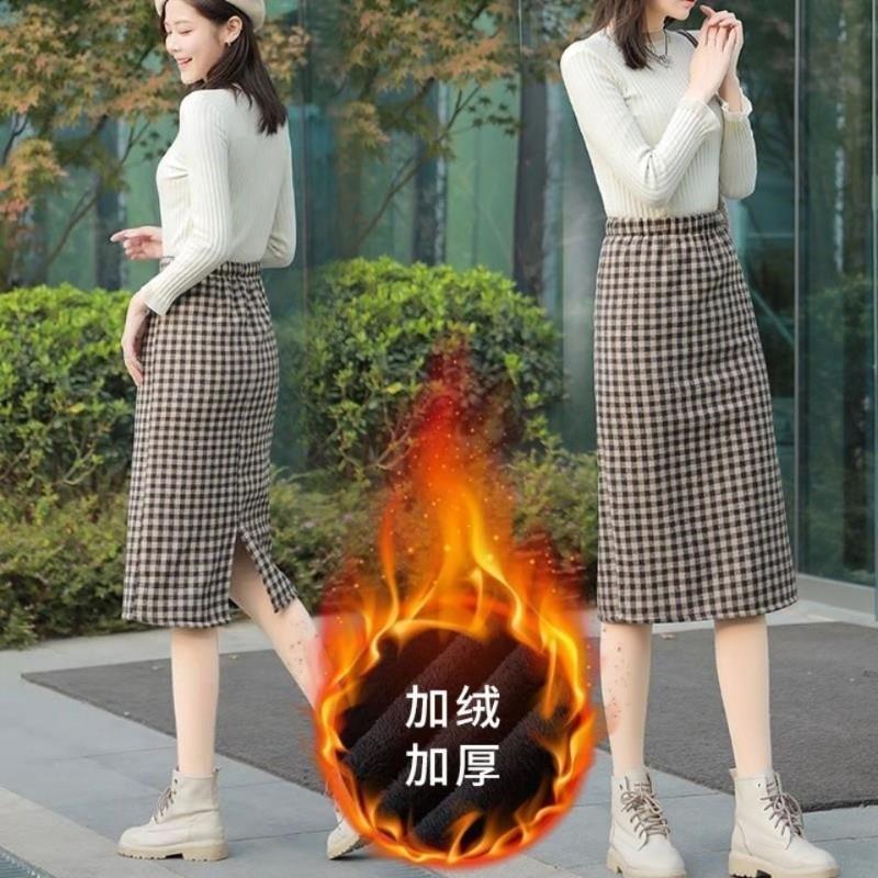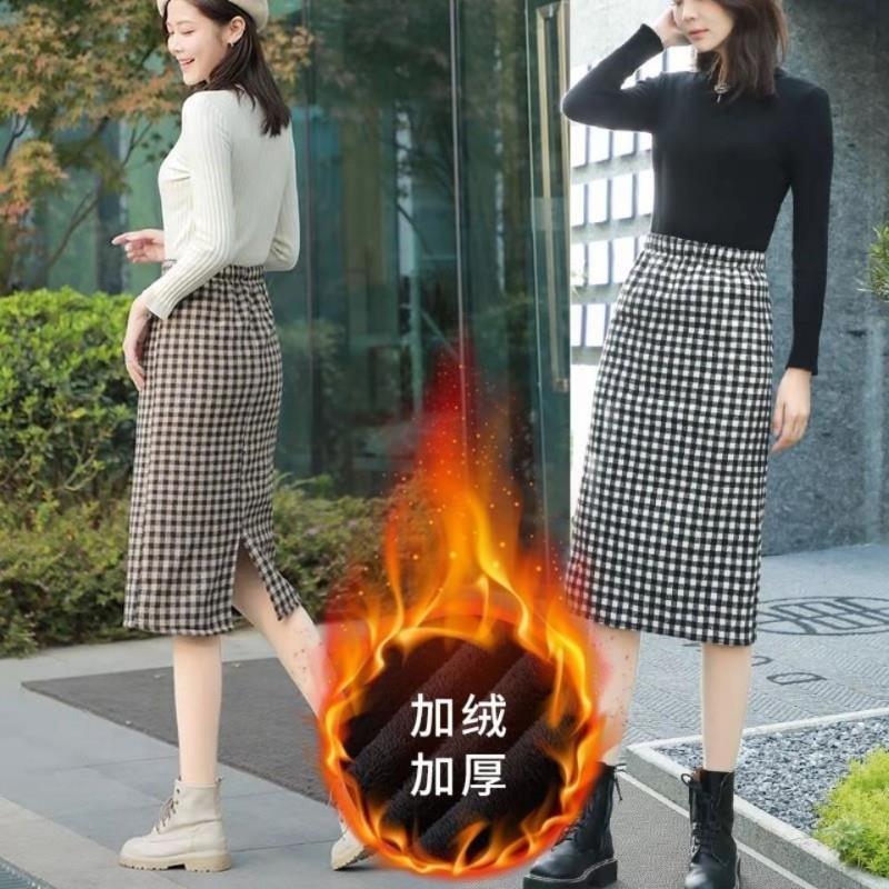 半身裙女秋冬新款后开叉毛呢格子高腰显瘦加绒加厚a字包臀裙高贵