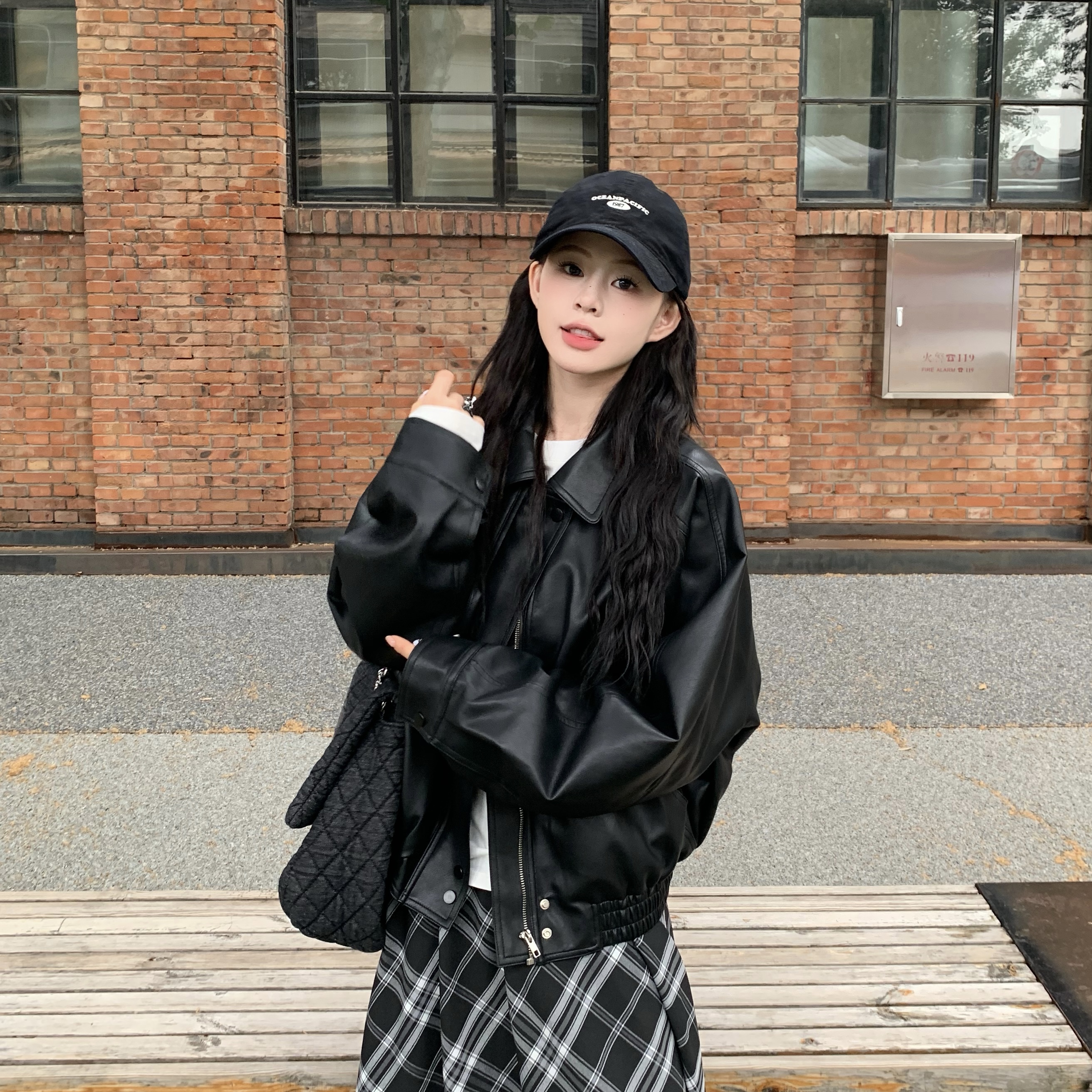 3MER哦哦三妹黑色皮衣短外套女2025秋新款港风复古宽松夹克棒球服