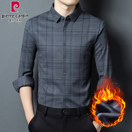 皮尔卡丹冬季男士长袖商务休闲格子衬衫加绒加厚免烫休闲保暖衬衣