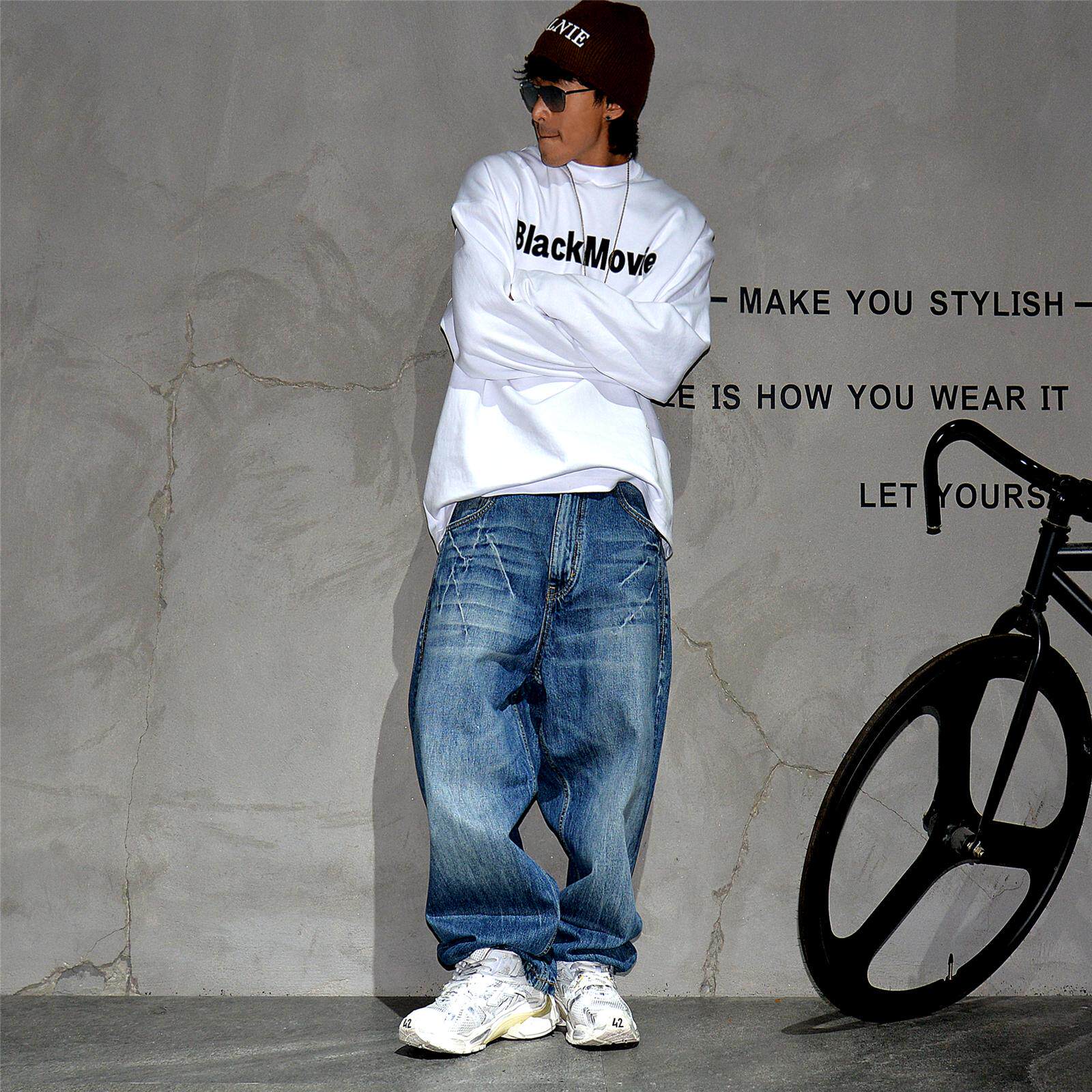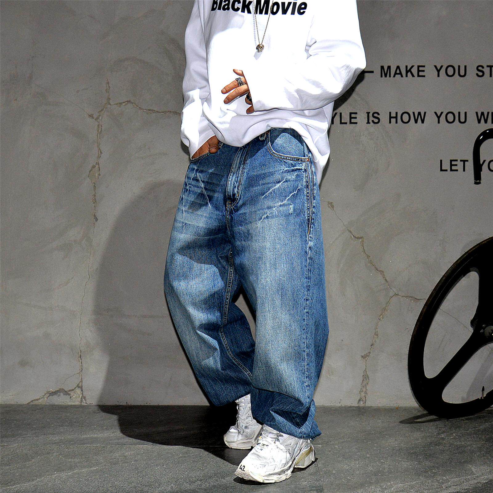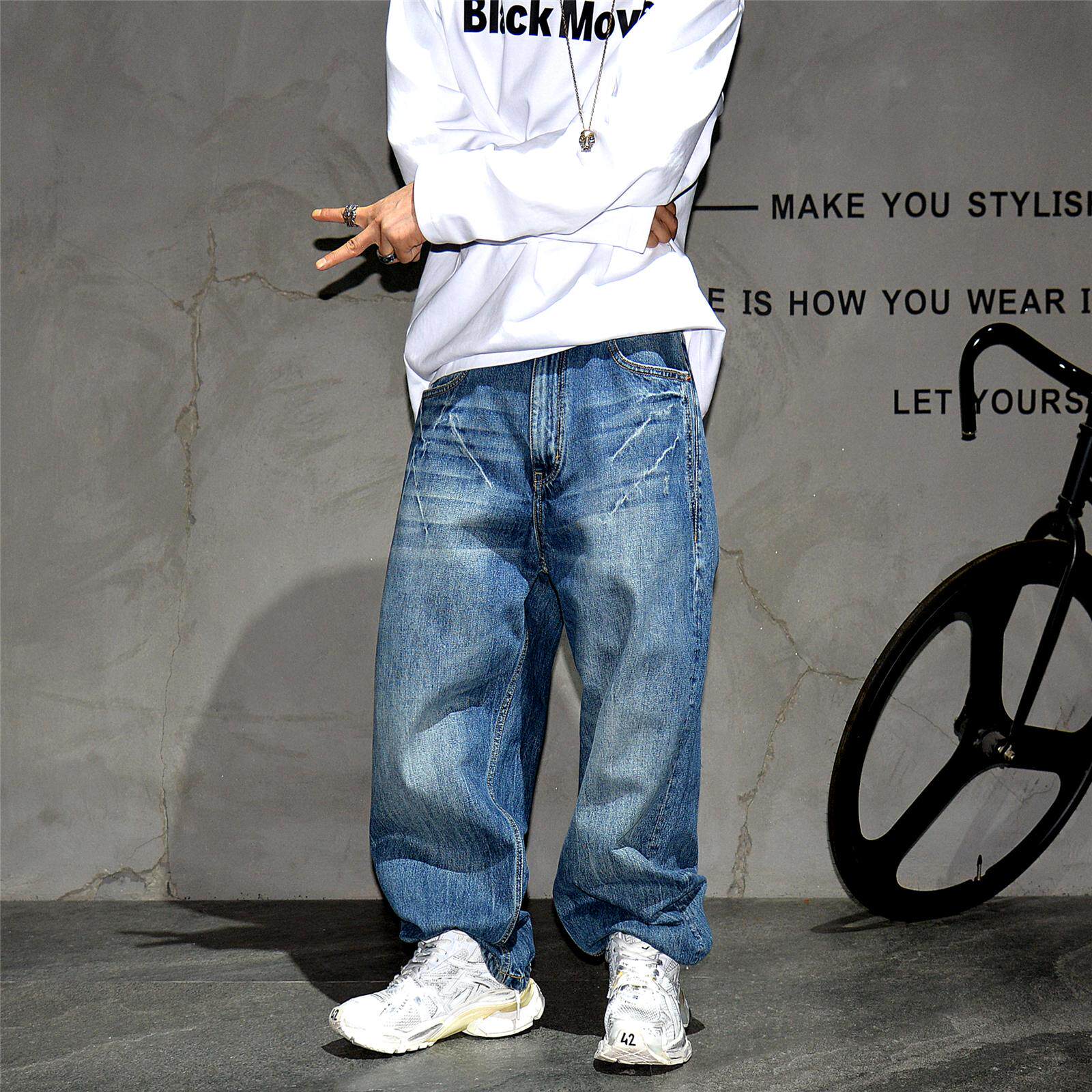 美式复古蓝色水洗做旧宽松阔腿牛仔长裤男潮牌痞帅哈伦直筒老爹裤