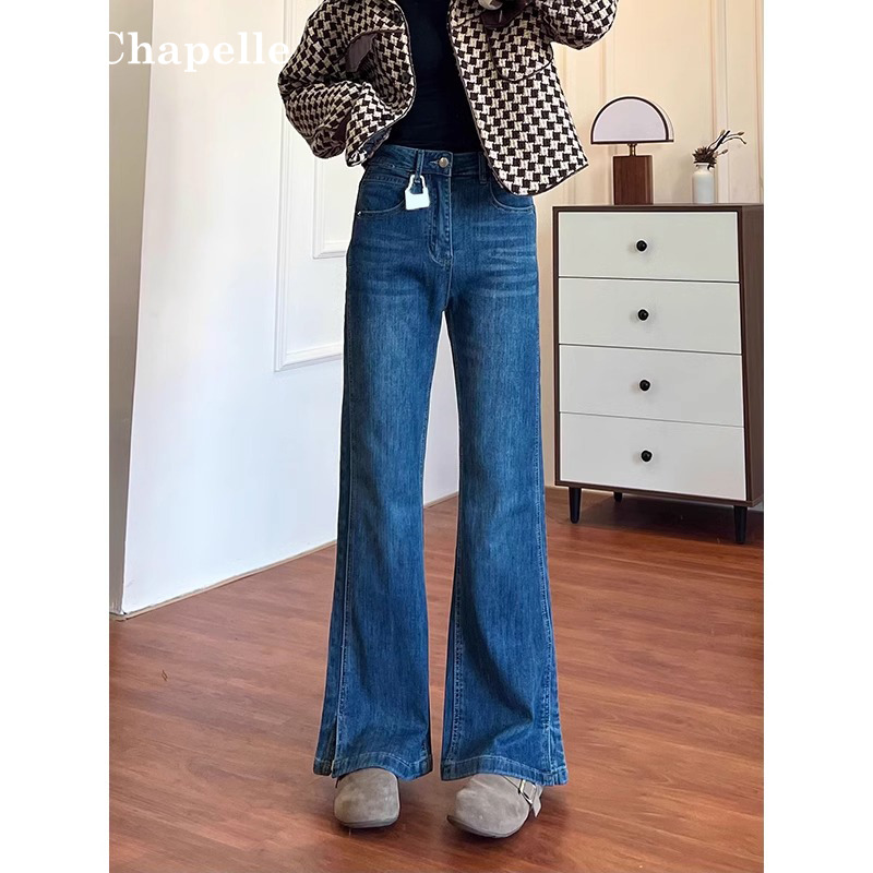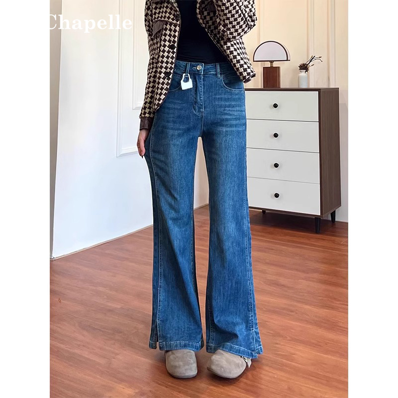 拉夏贝尔不贴腿开叉微喇牛仔裤女春秋高腰梨型身材显瘦百搭喇叭裤