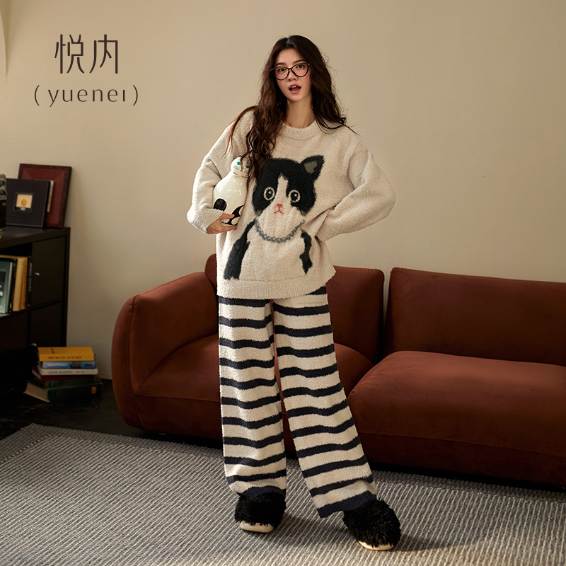 悦内半边绒睡衣女款冬季冬天珊瑚绒保暖毛绒家居服秋冬时尚可爱猫