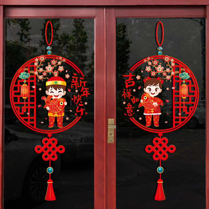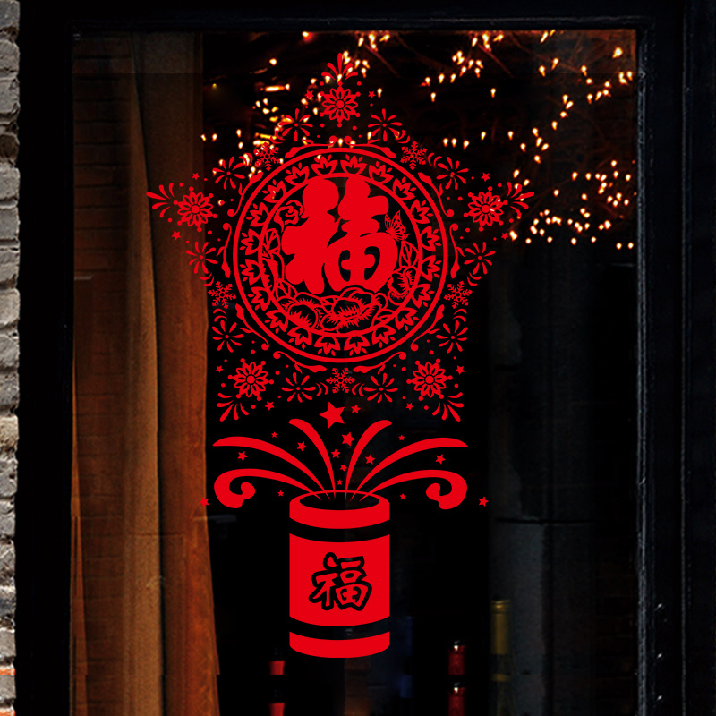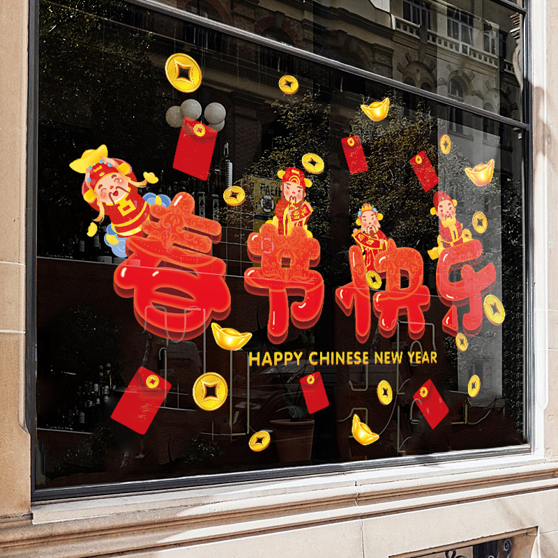 新年舞狮贴画静电贴兔年店铺玻璃贴门贴纸春节过年装饰墙贴窗花贴