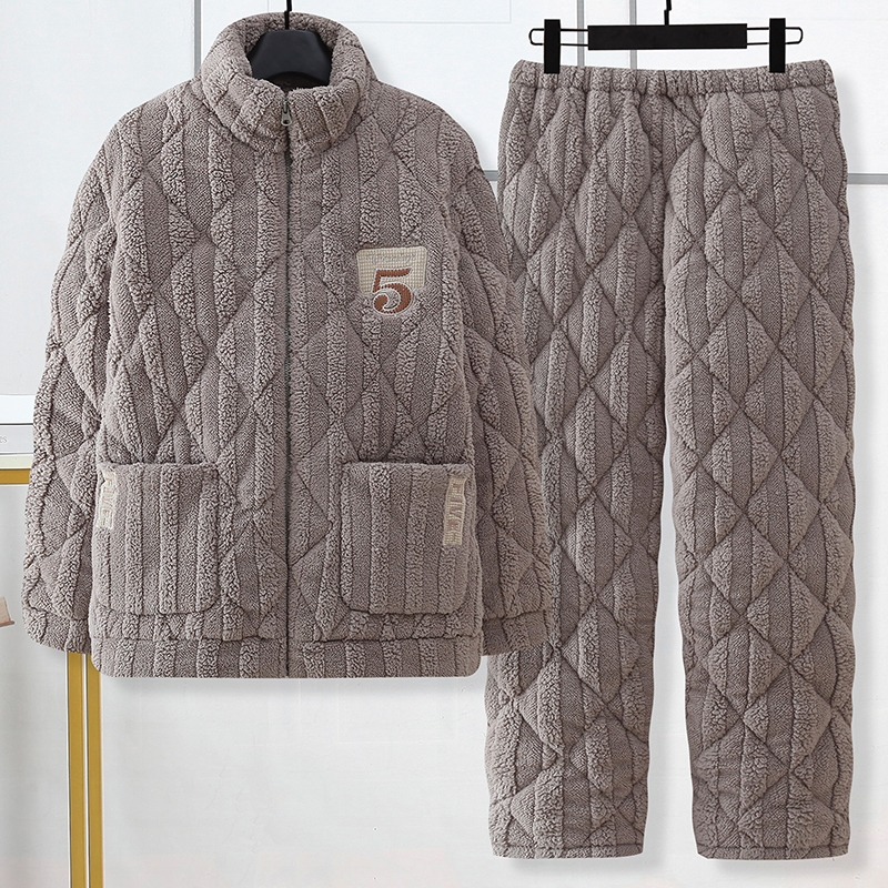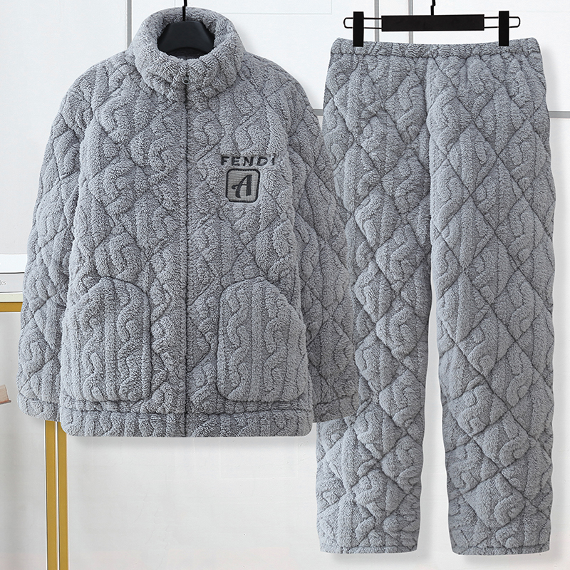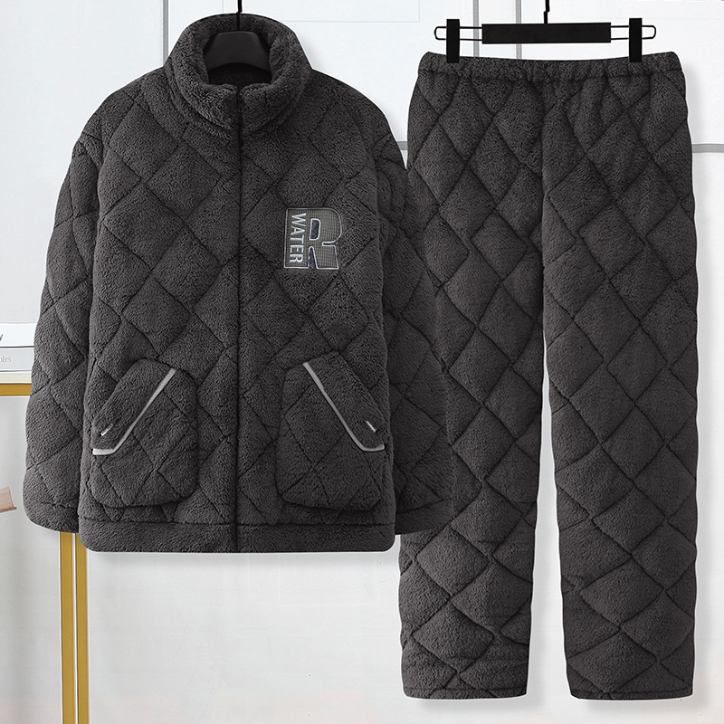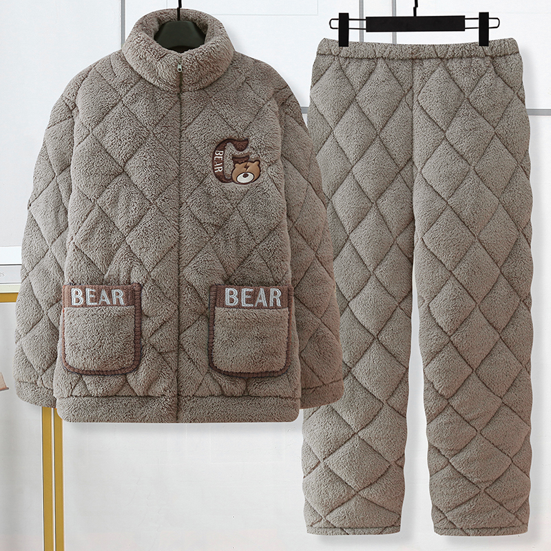 三层夹棉睡衣男士秋冬季保暖珊瑚绒加绒加厚冬天款男式家居服套装