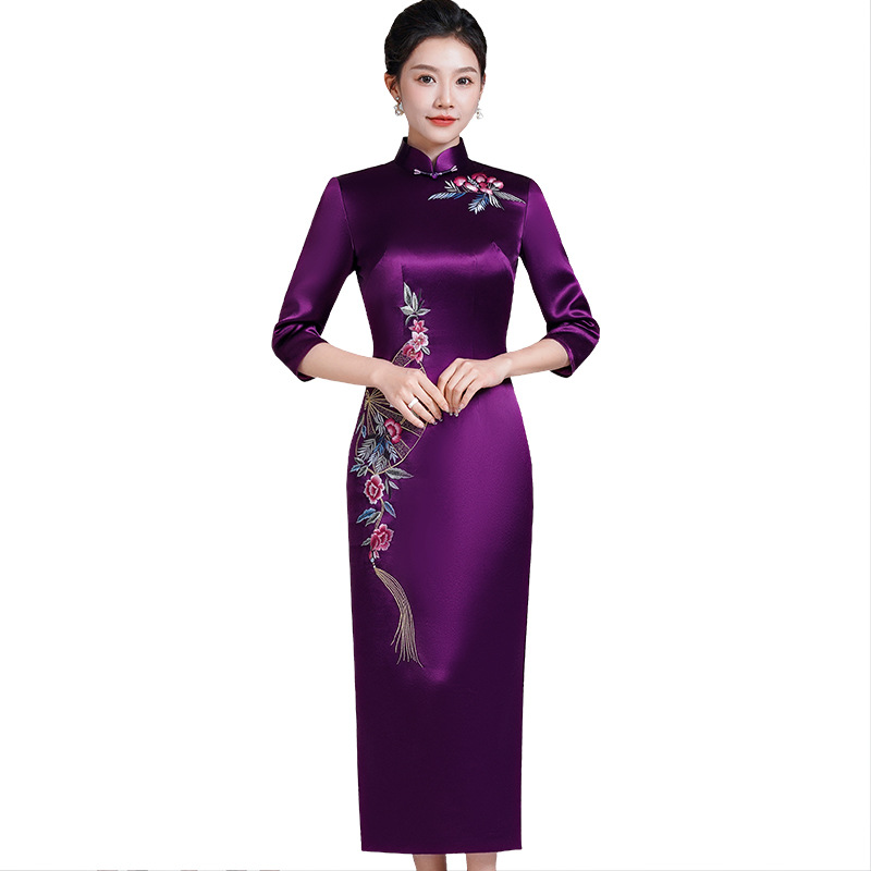 高端刺绣醋酸缎喜婆婆婚宴装旗袍2023新款连衣裙婚礼妈妈礼服春秋