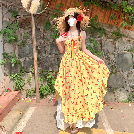 甜妹风奶黄樱桃印花吊带连衣裙海边度假露背小个子内衬蕾丝半身裙