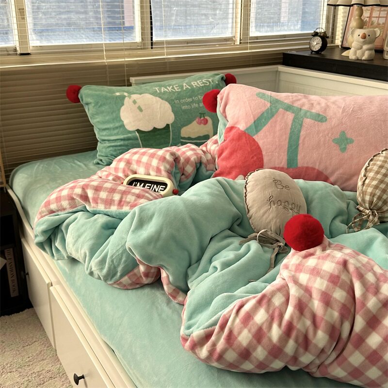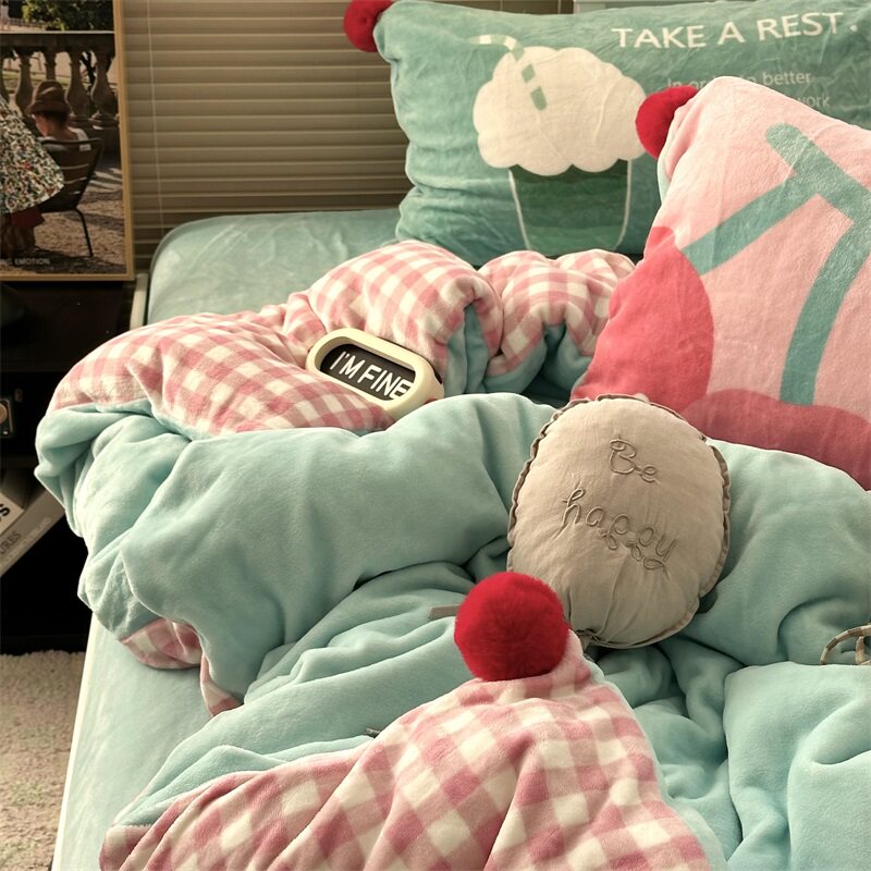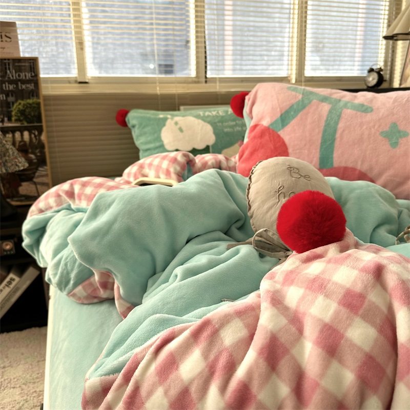ins少女混搭风可脱线毛球冬季牛奶绒四件套加厚保暖珊瑚绒三件套