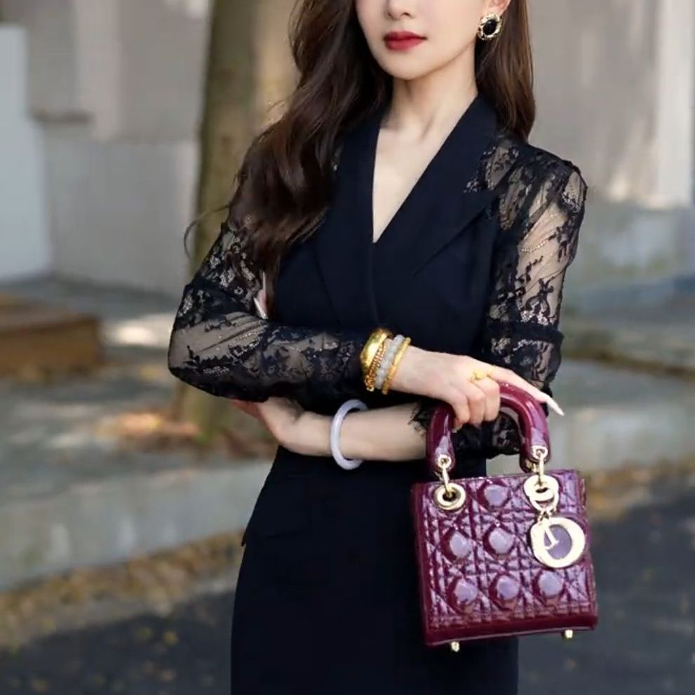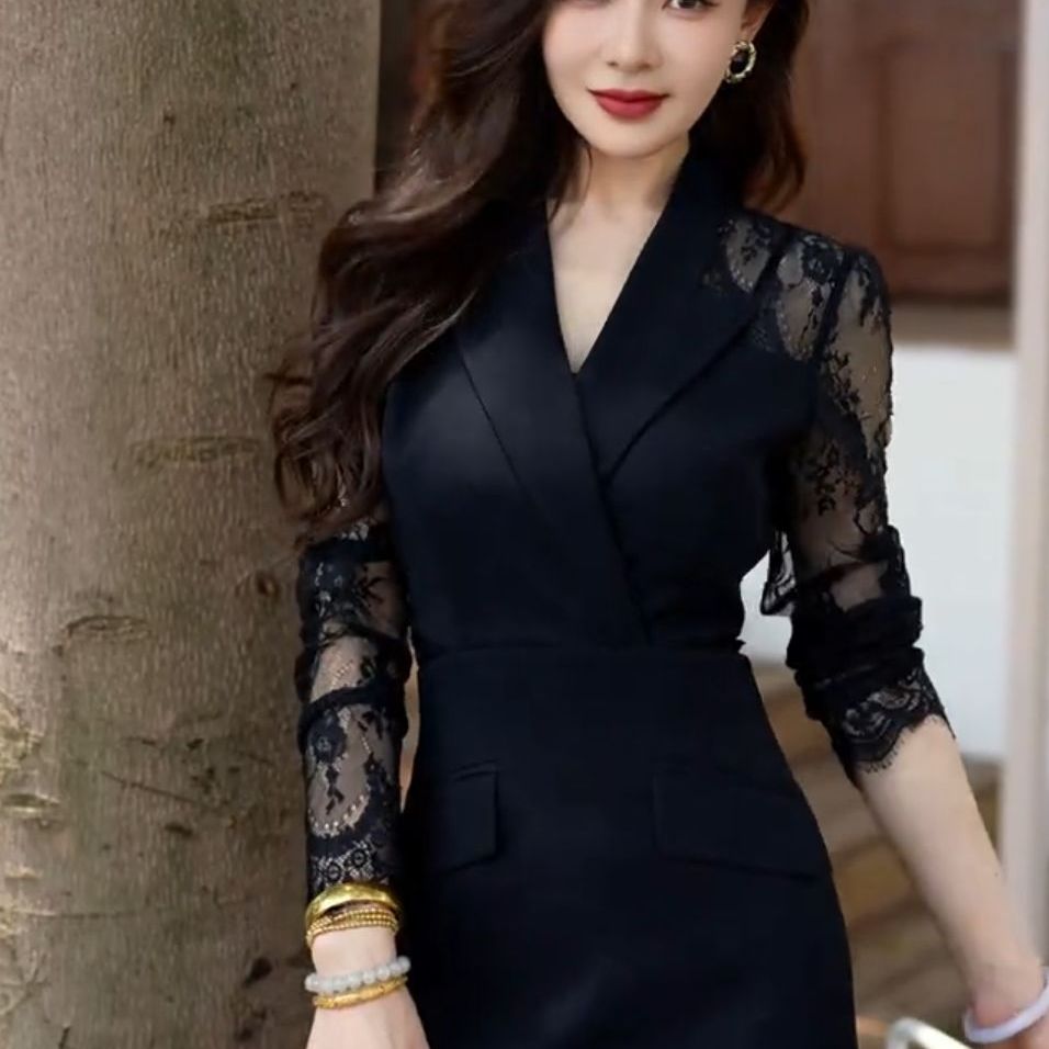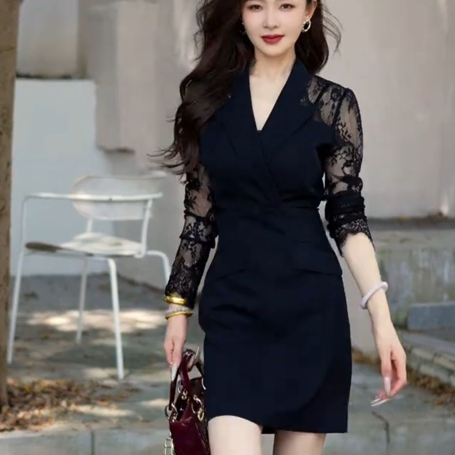 网红爆款时尚连衣裙女2025秋季新款韩版洋气显瘦蕾丝拼接西装裙潮