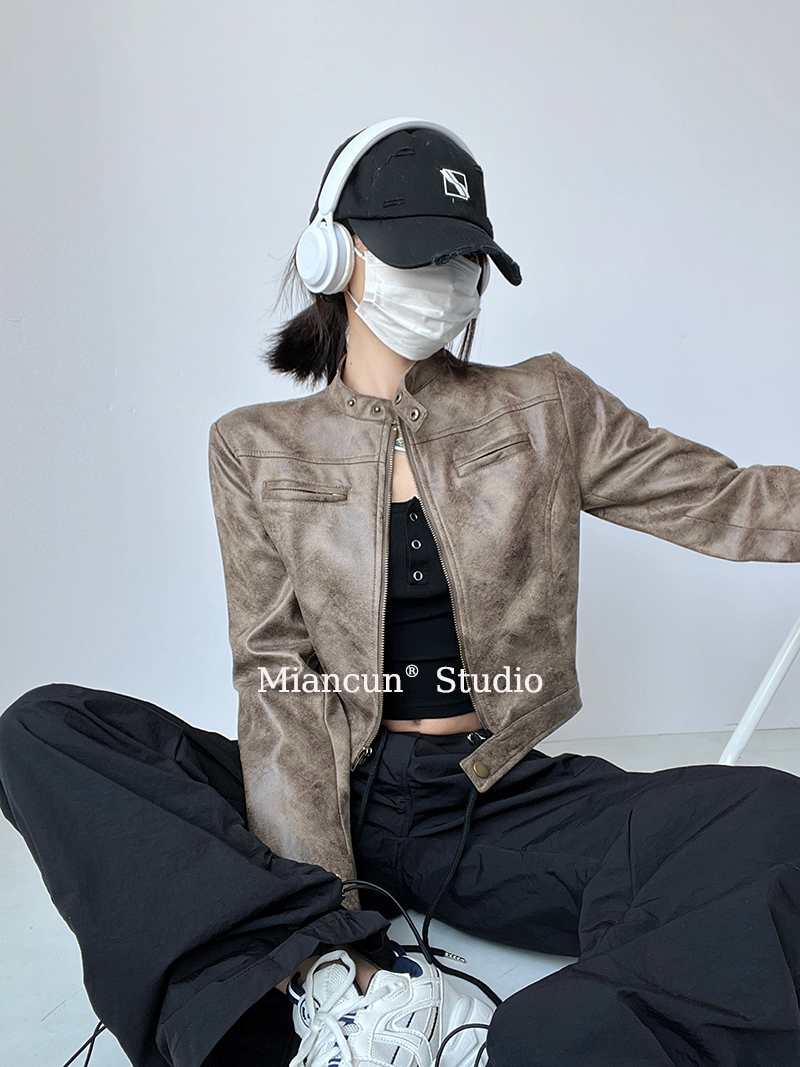 MianCun做旧复古机车仿麂皮夹克2025年新款立领皮衣短款外套女
