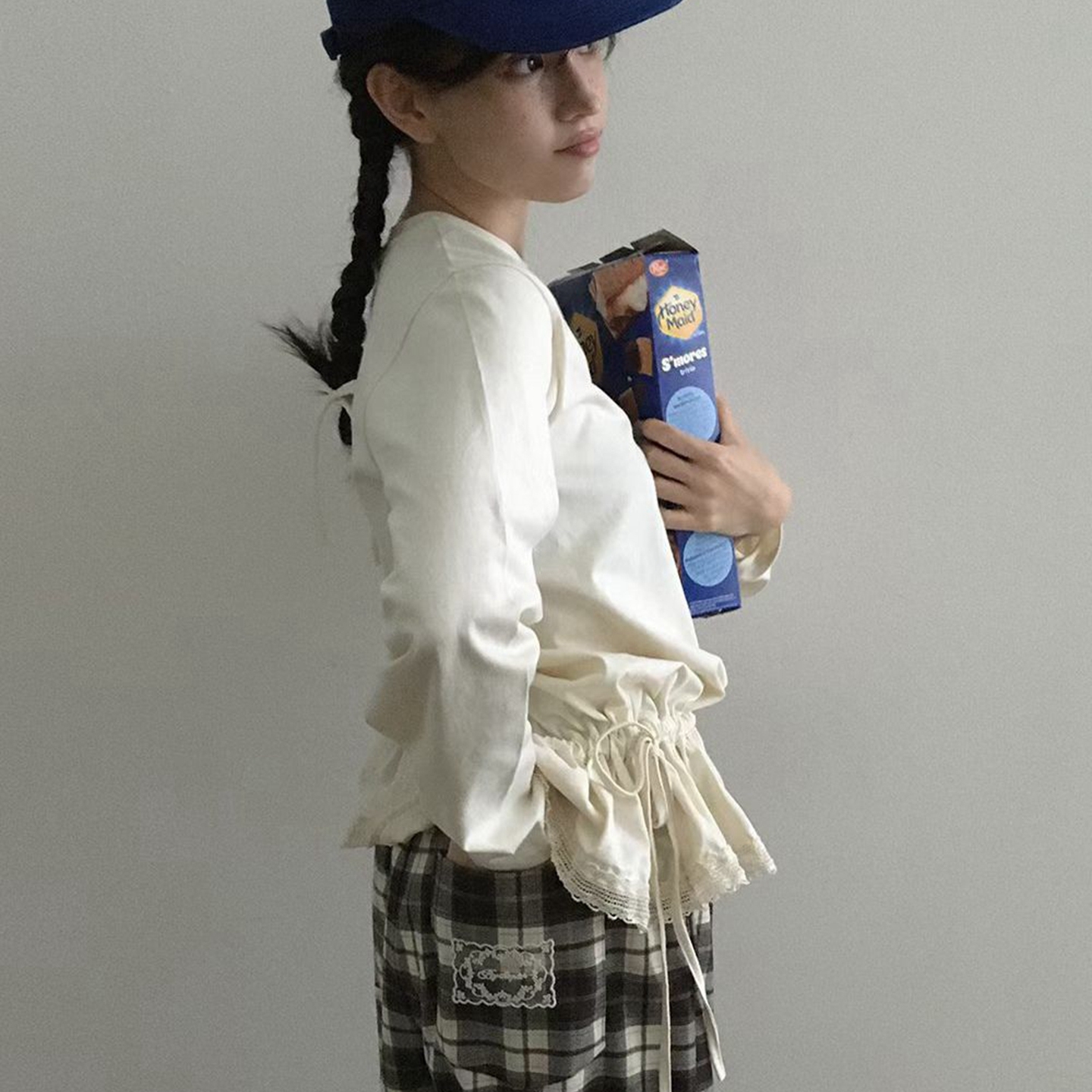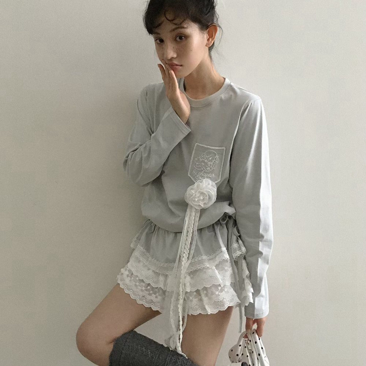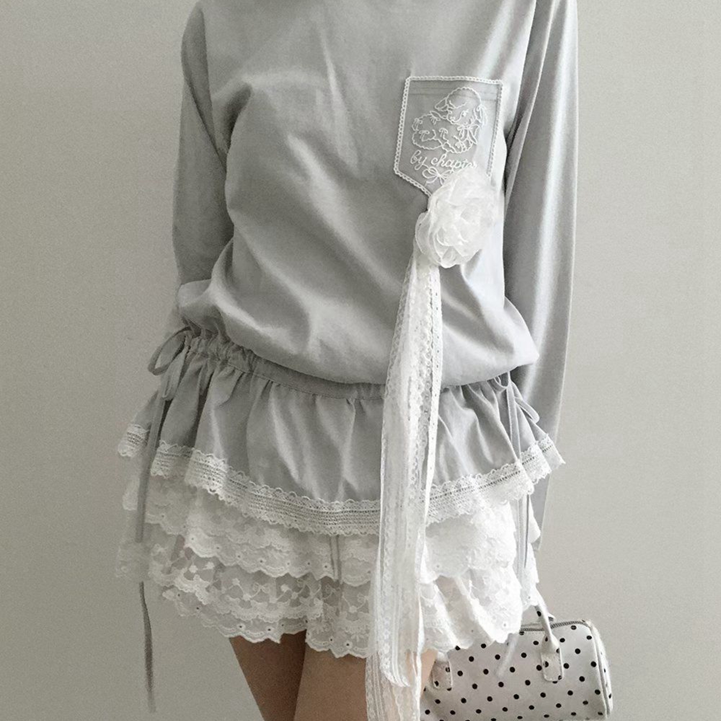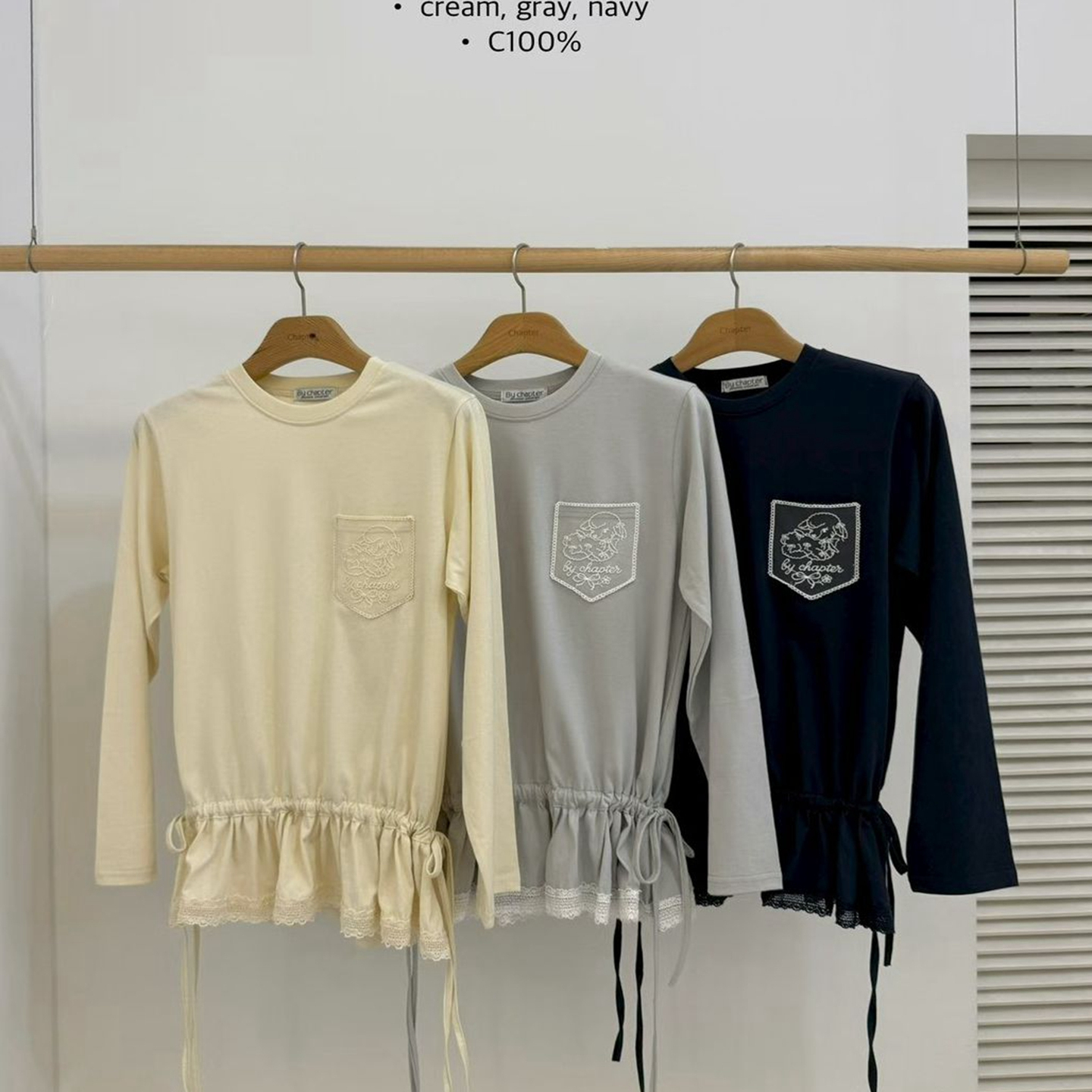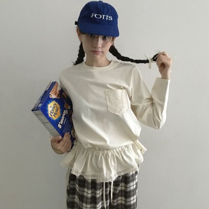 现韩国东大门代购by chapter2025秋百搭简约抽绳收腰蕾丝拼接T恤