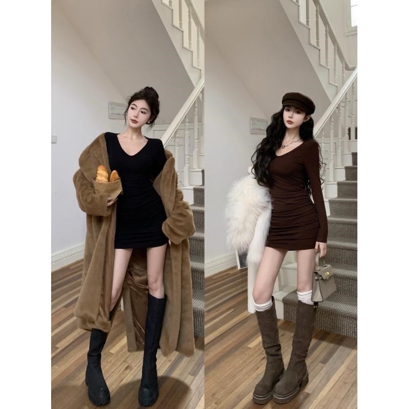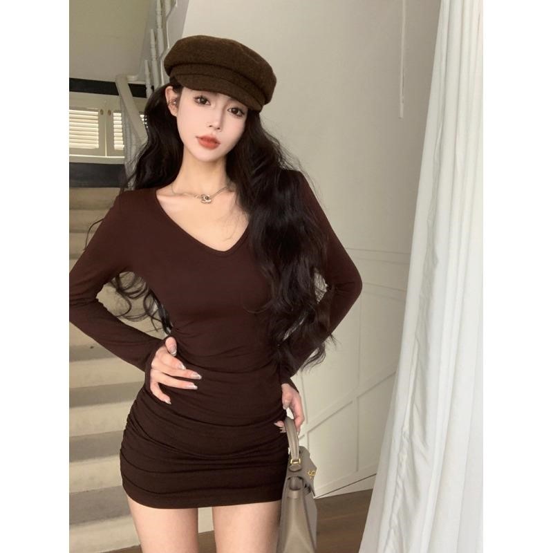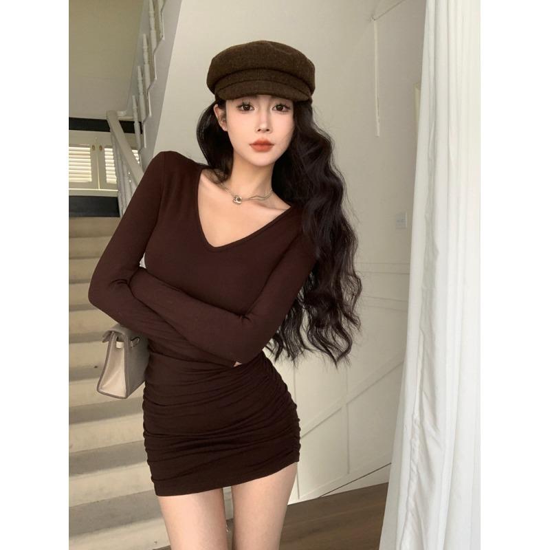 美式辣妹v领长袖连衣裙女秋季修身褶皱包臀裙黑色收腰加绒短裙子