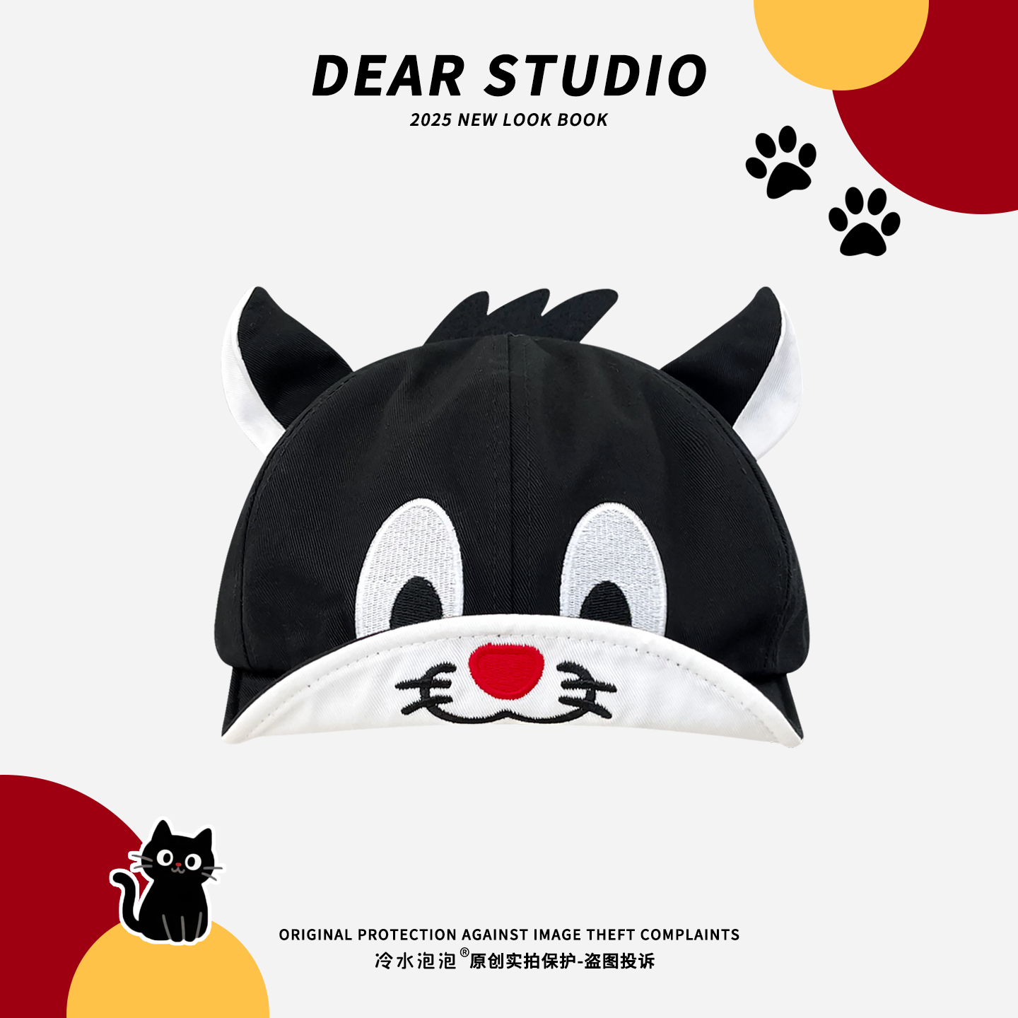 可爱大傻猫韩国黑猫软顶翻檐鸭舌帽子女学生情侣百搭显脸小棒球帽