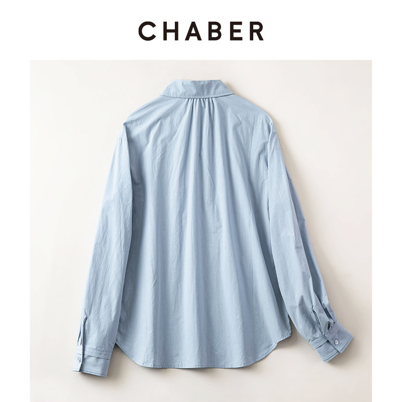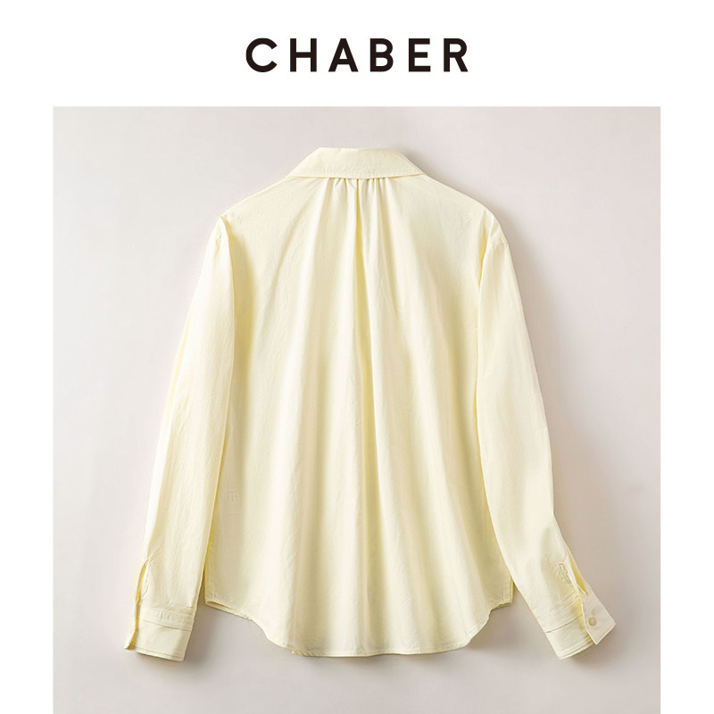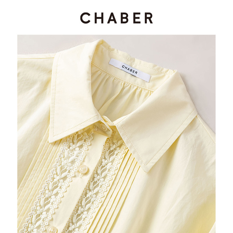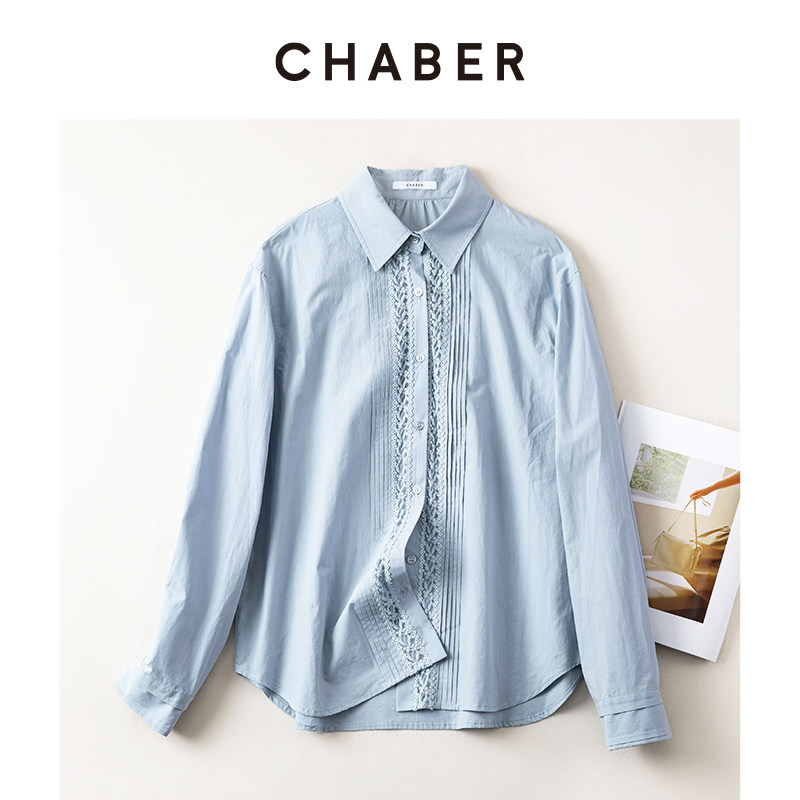 chaber巧帛春季新款蕾丝拼接褶皱纯棉上衣时尚减龄翻领长袖女衬衫
