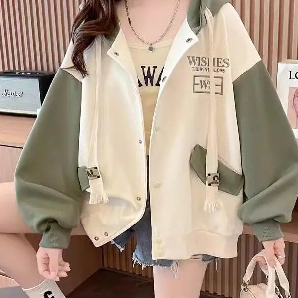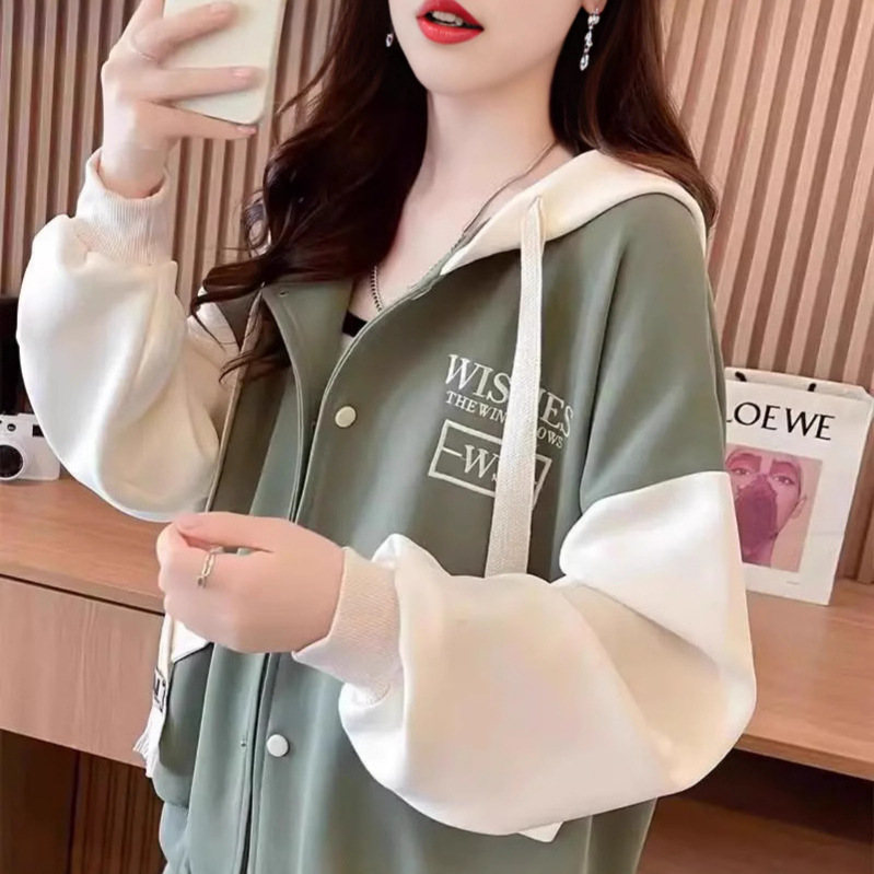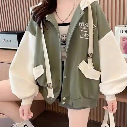 秋冬加绒款开衫棒球服外套女宽松大码女装中长款秋季撞色连帽卫衣
