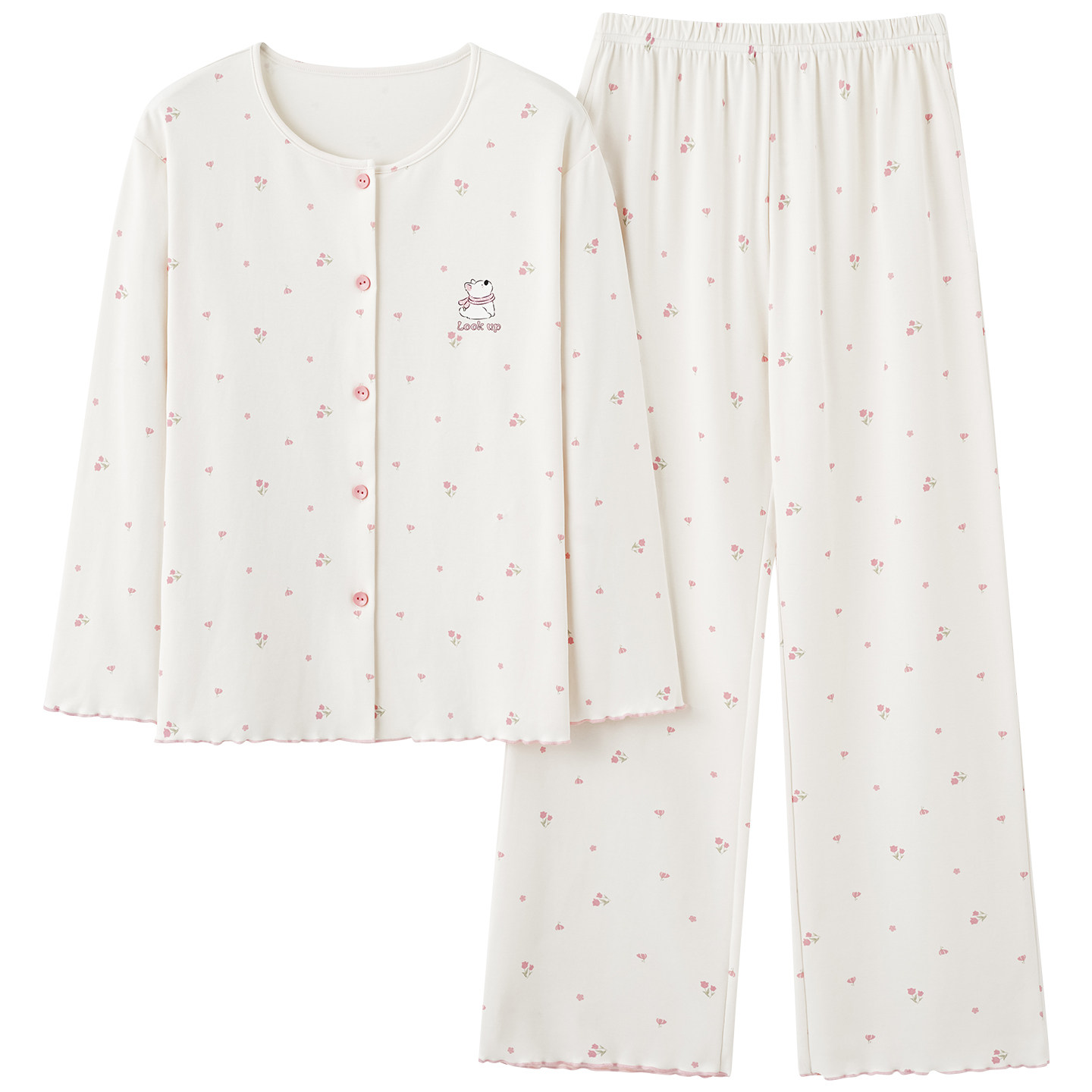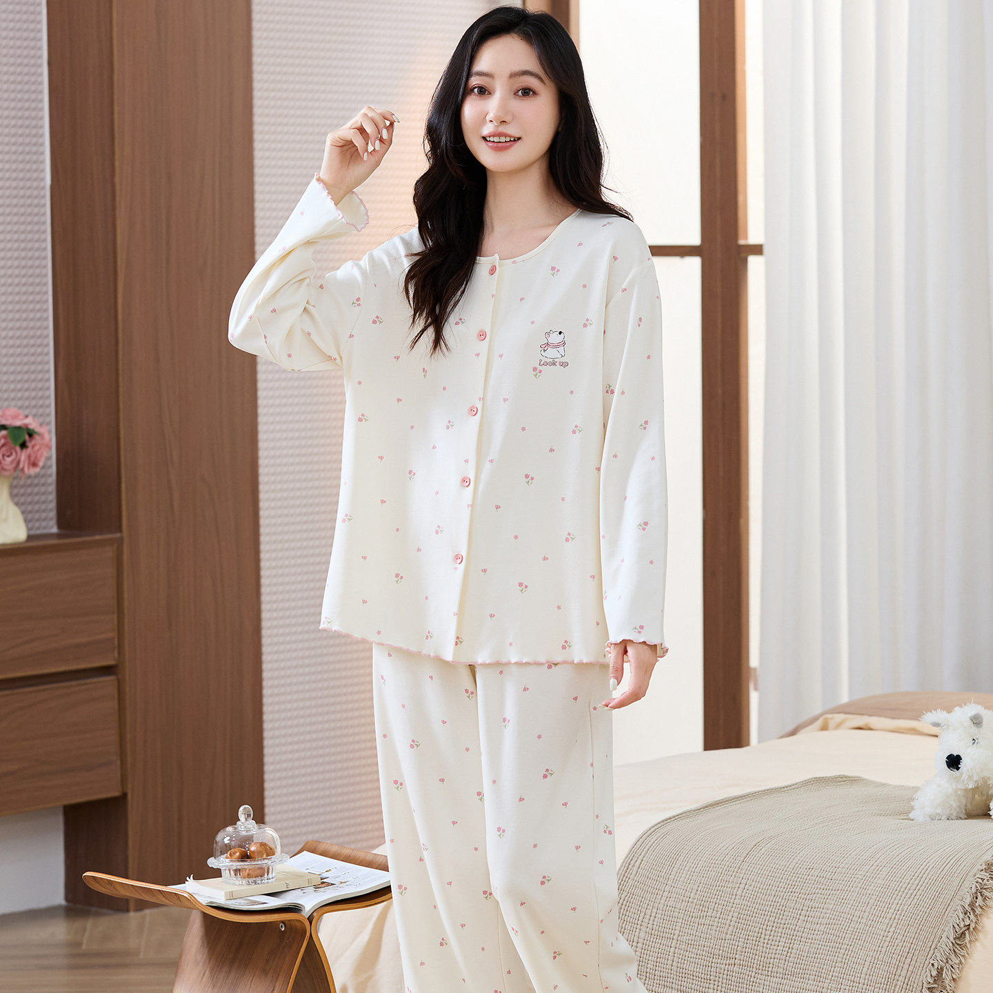 莫代尔棉睡衣女士春秋季长袖开衫卡通可爱少女碎花家居服宽松套装
