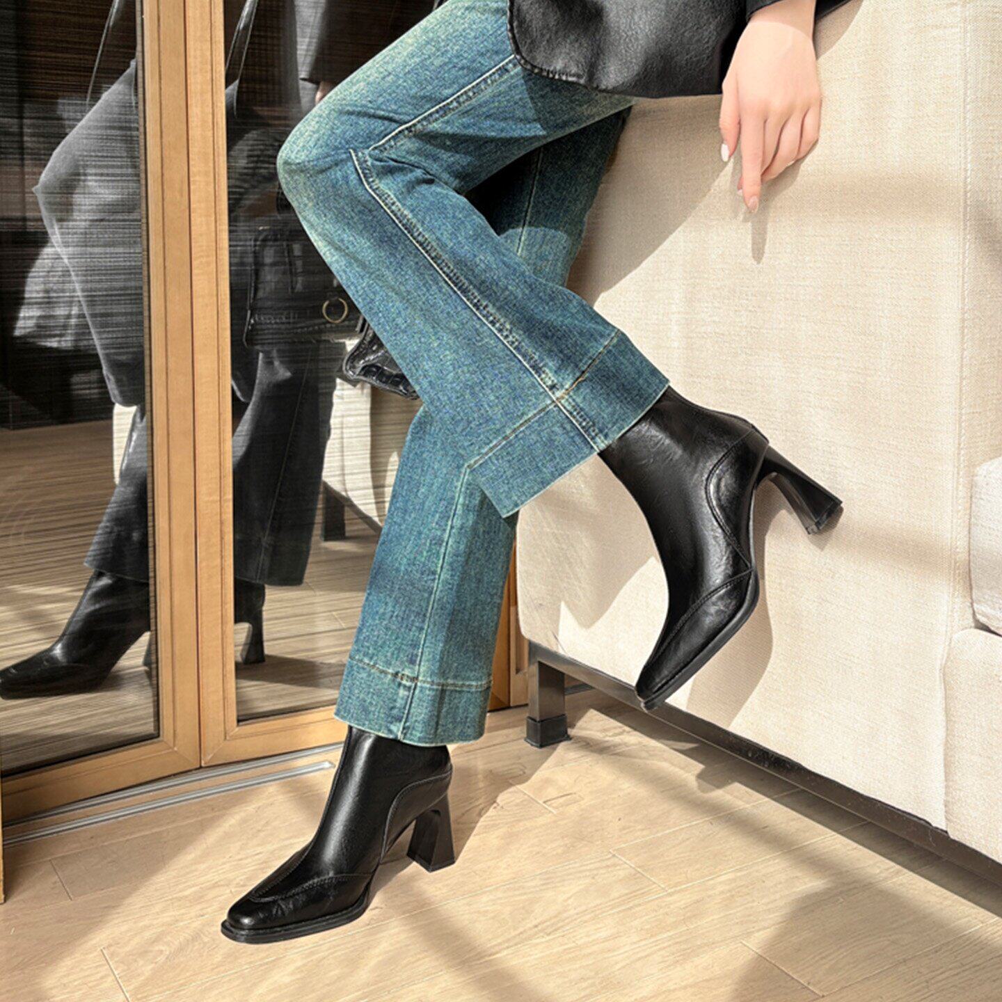 真皮高跟方头短筒显瘦马丁靴女
