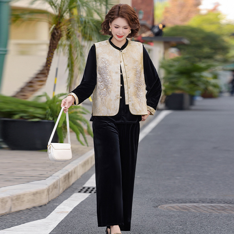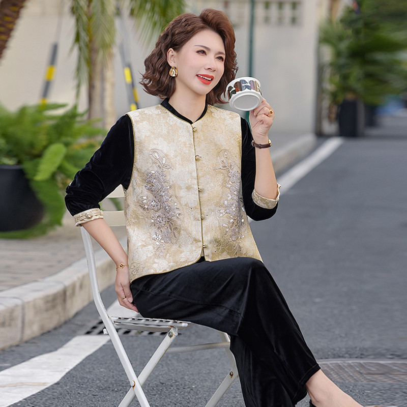 新中式妈妈春装金丝绒套装国风三件套洋气中老年女春秋季新款马甲