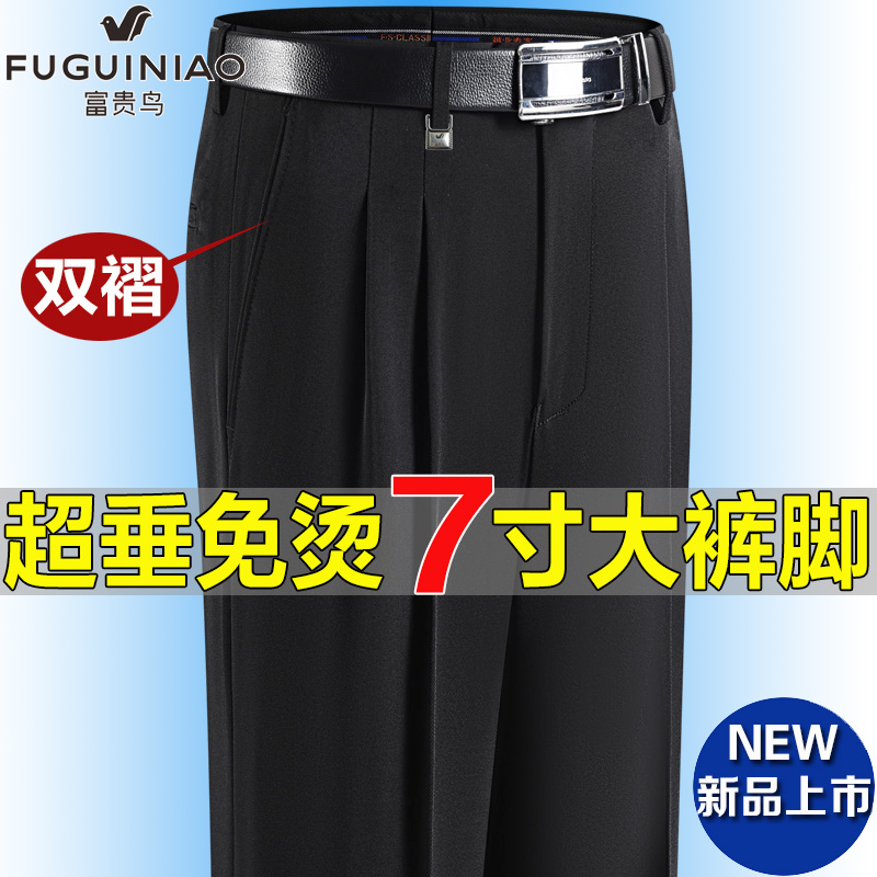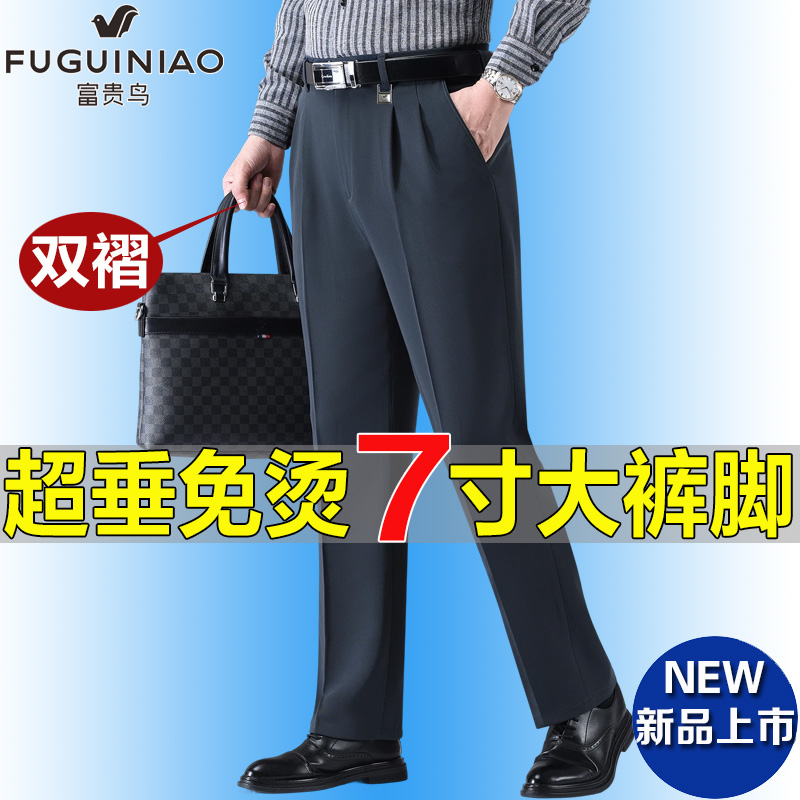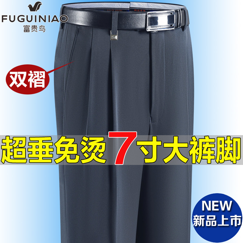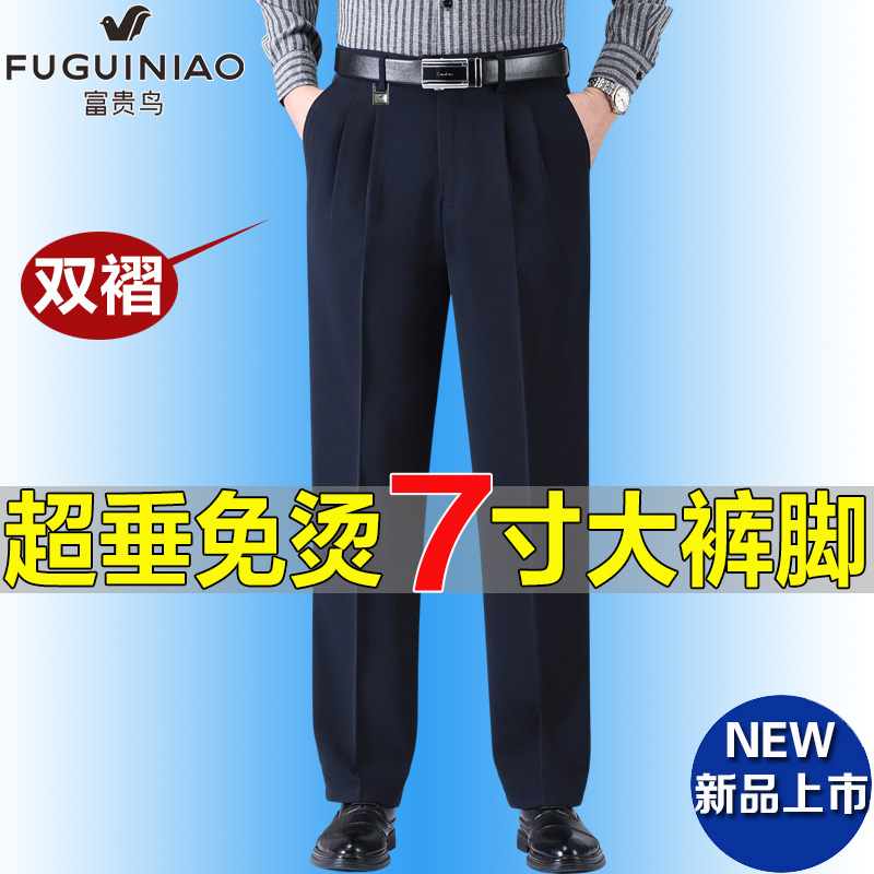 富贵鸟秋冬厚款毛蚕丝西裤男双褶宽松中老年高腰深档7寸大裤脚