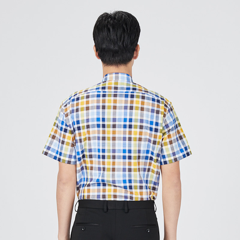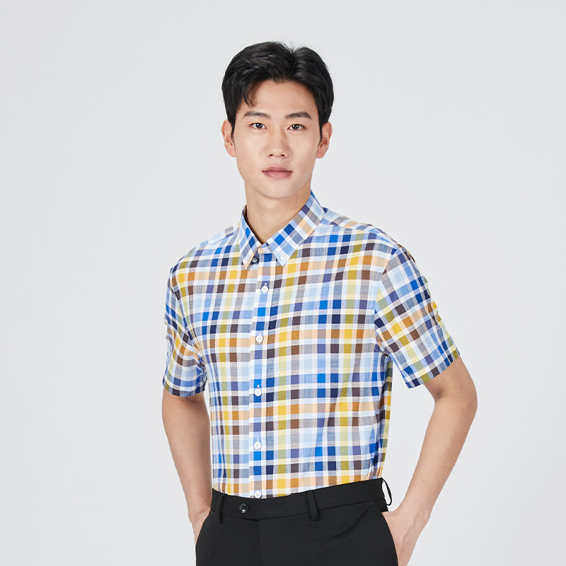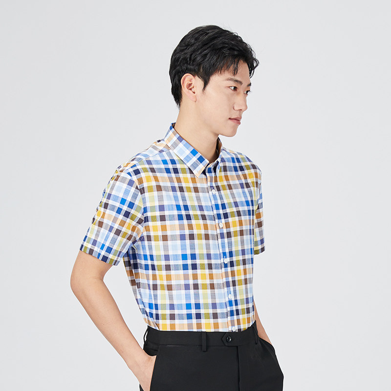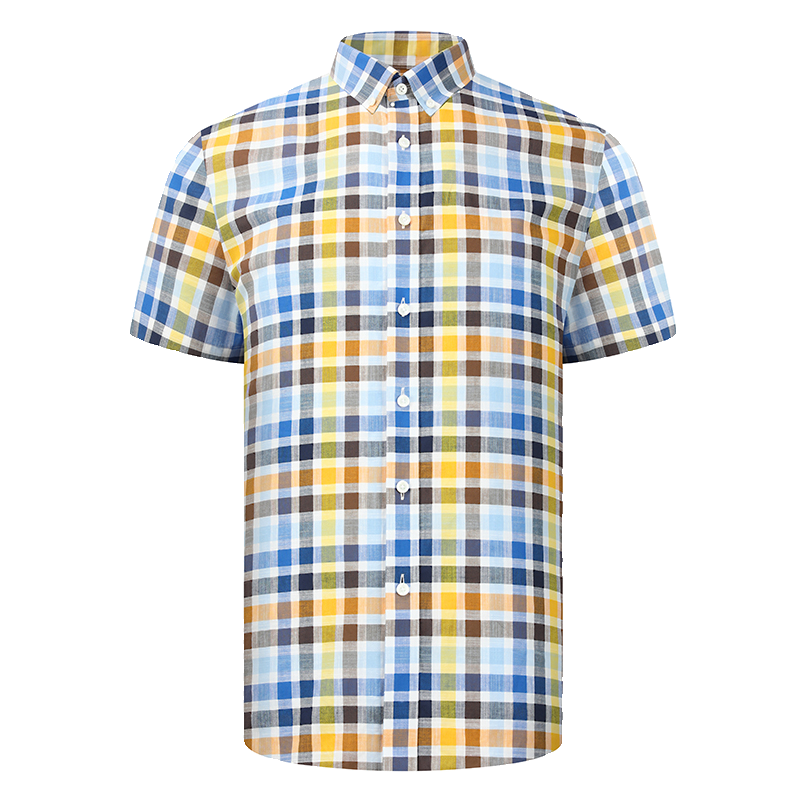 乔治白春夏男士短袖衬衫纯棉纽扣领蓝黄格子衬衣休闲修身绅士扣